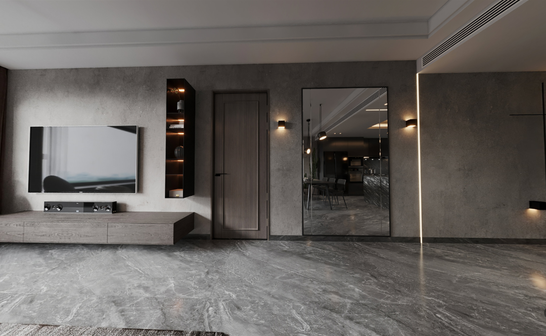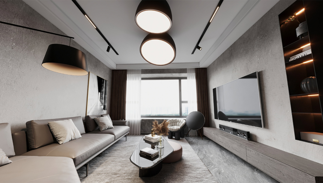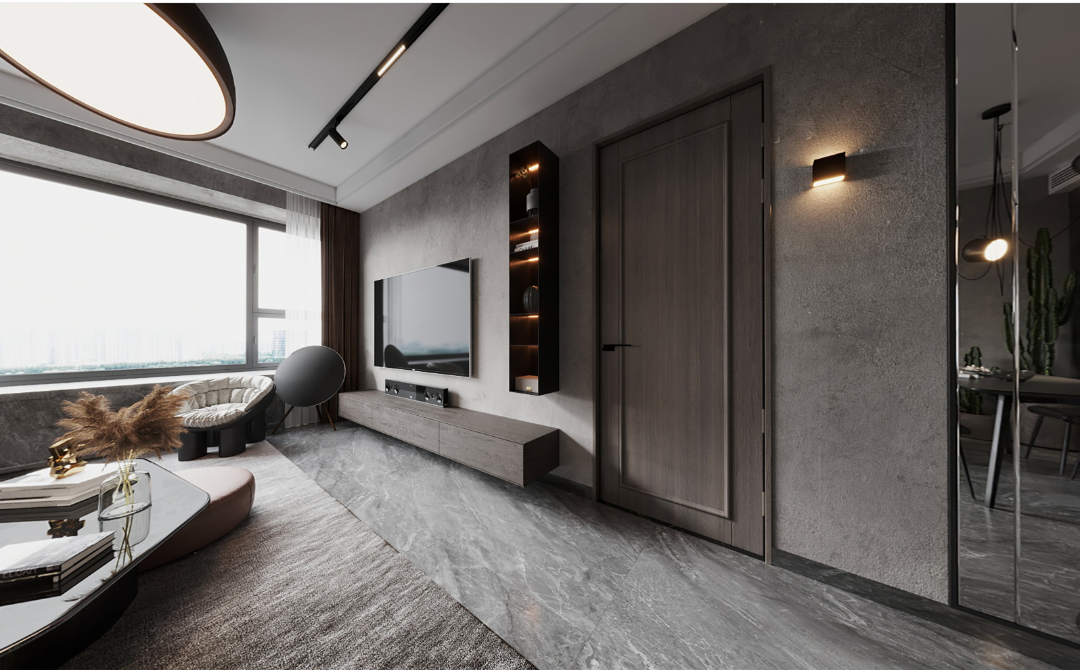 客厅选择了黑灰色的主基调,壁面及家具采用了大量深色,并让天花及地面保持浅色,又以木皮、水泥质感添加深色中的层次感。