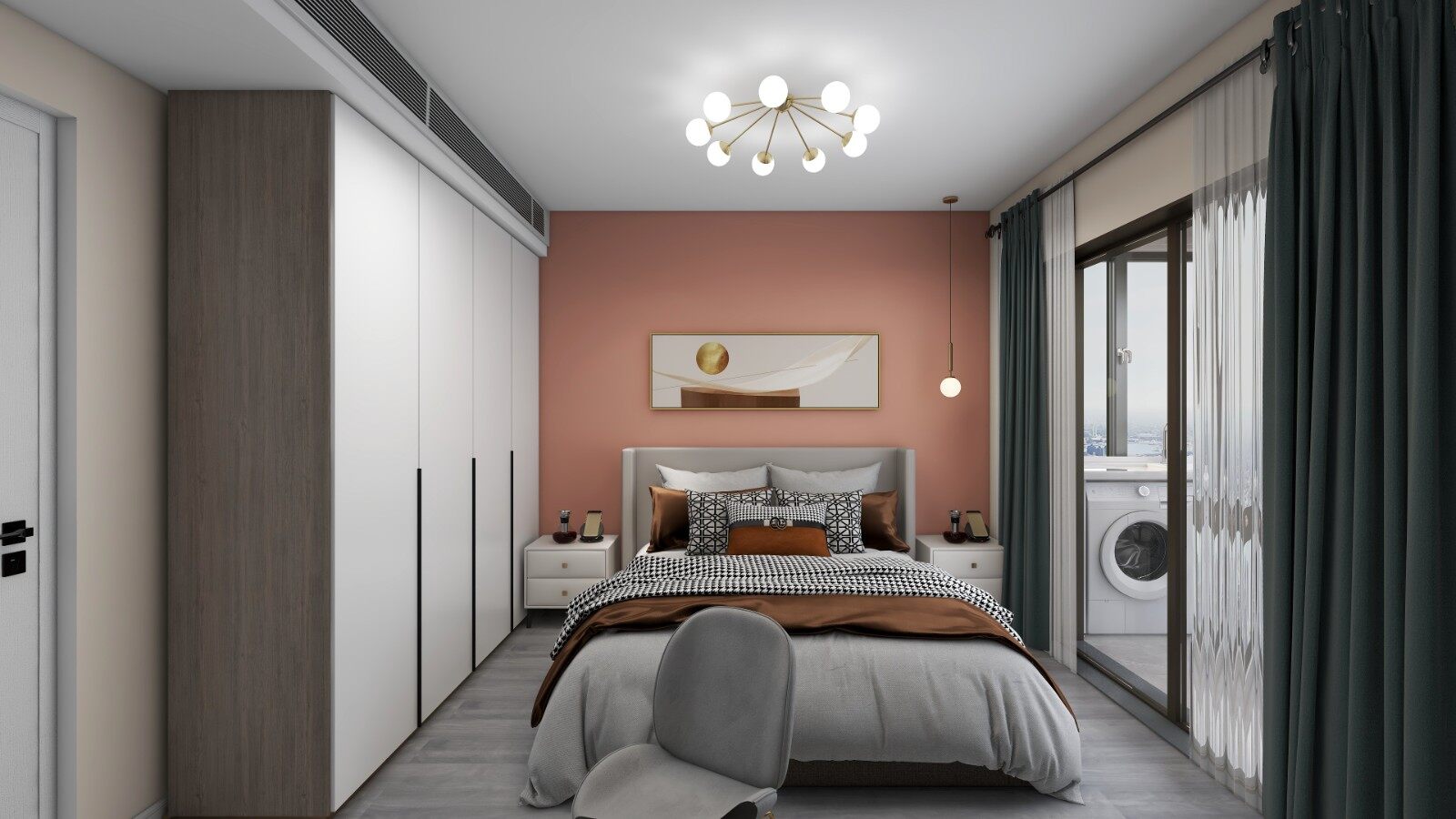 卧室增加大衣柜,书桌等功能满足日常的需求。以暖色的背景打造温情的我卧室情绪!