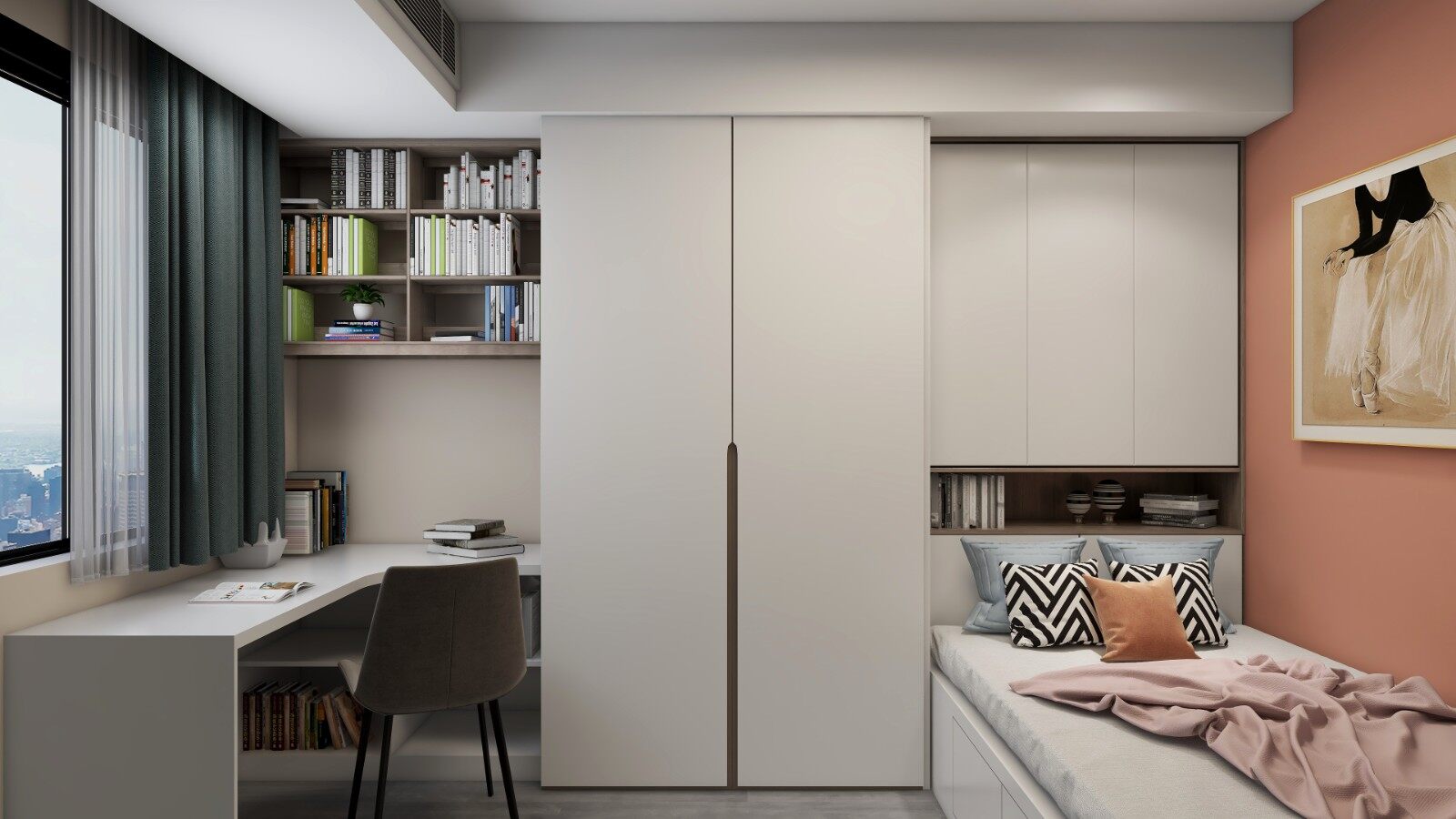 次卧设置常规衣柜,足以放置被褥衣物等,同时设置书桌台,方便业主学习办公等。
