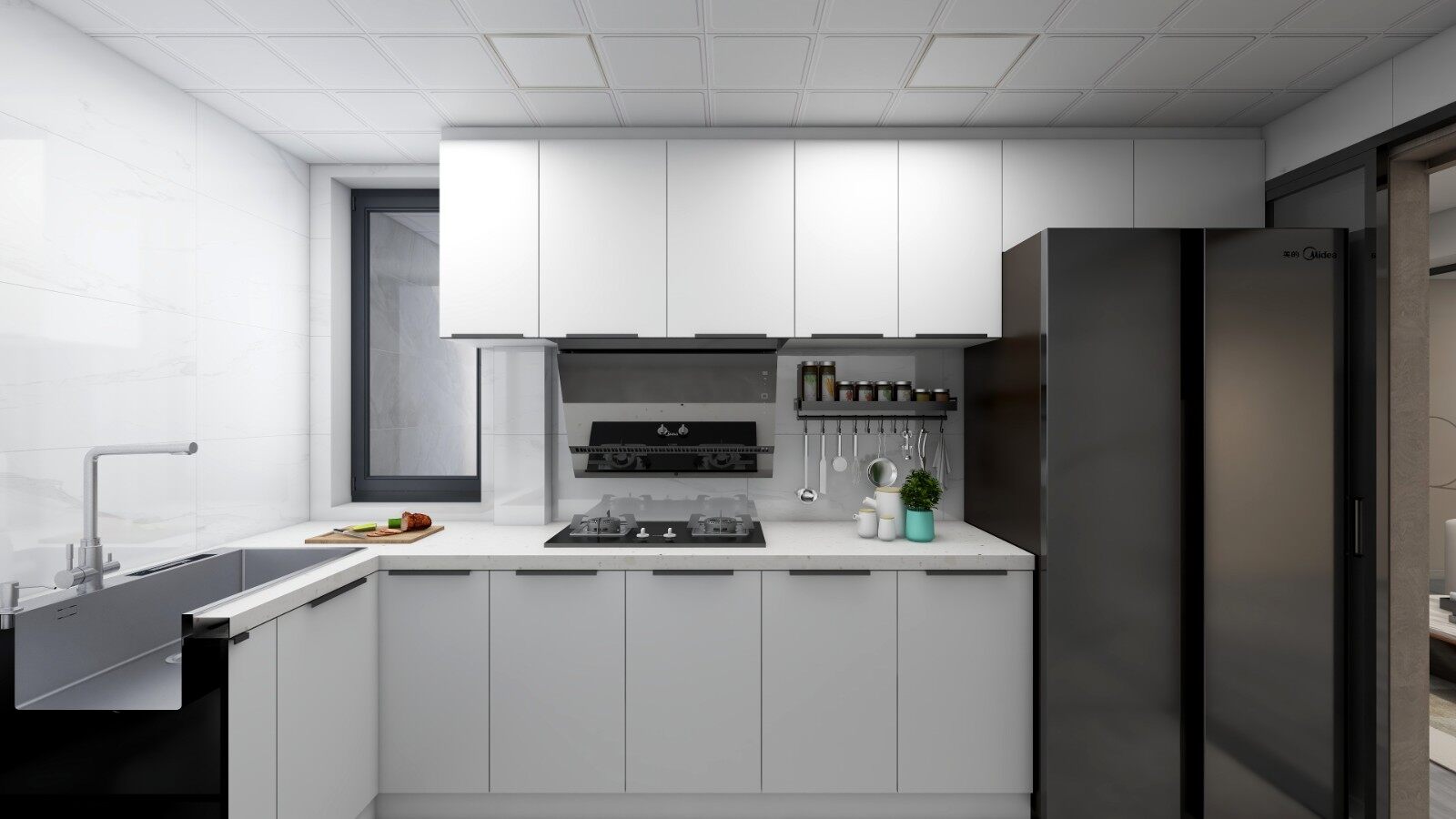 厨房设计为常用的L型,满足日常烹饪,切炒放一气呵成,加上大空间冰箱,可以容纳多种食材存储。