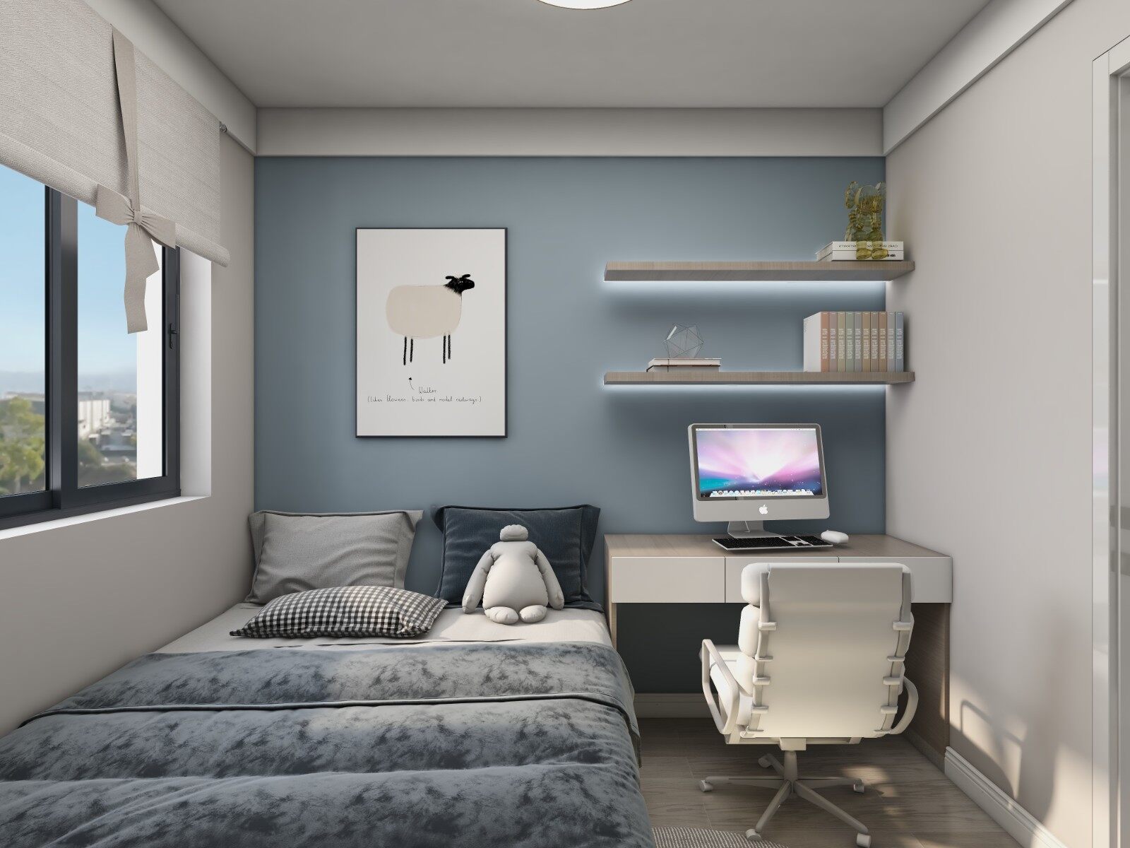 次卧为孩子的房间,增设学习桌,便于阅读学习!蓝色的背景墙,增加空间纵深感,也符合孩子的审美!