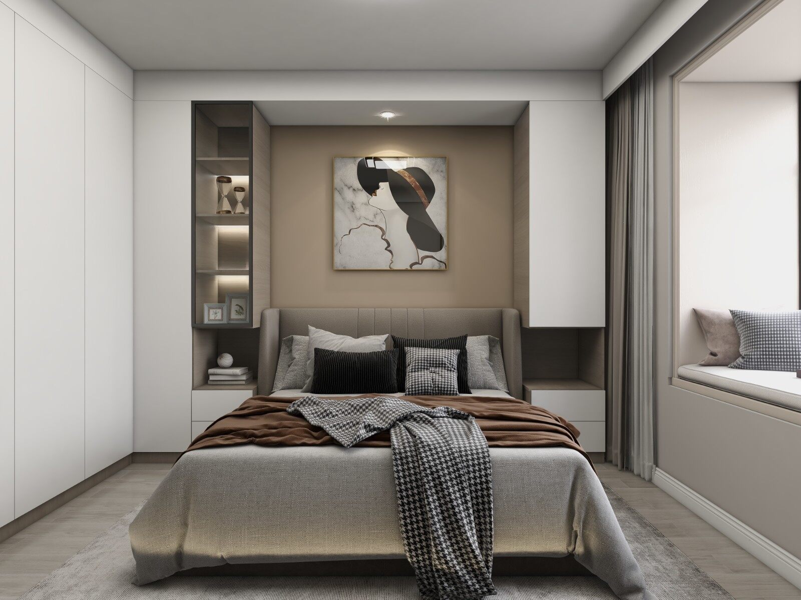 卧室以实用为主,一柜到顶方便业主放置一些衣物被褥,墙壁同样设置储物空间,让卧室琐碎归位,空间井井有条!