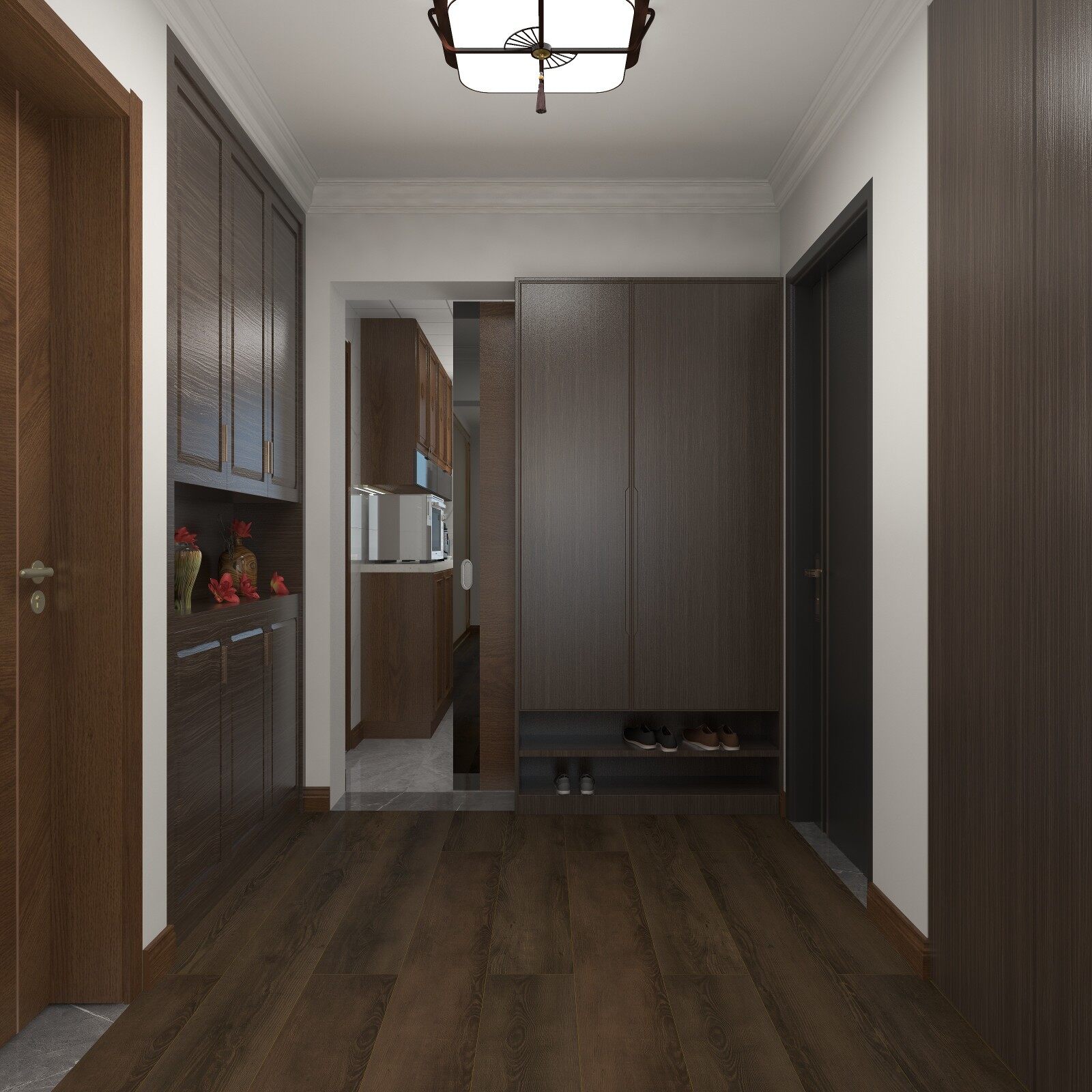 进门玄关处设置鞋柜,方便业主一家放置鞋子,中间镂空部分便于业主随手放置钥匙雨伞等物品,设置镜子便于业主整理妆容。