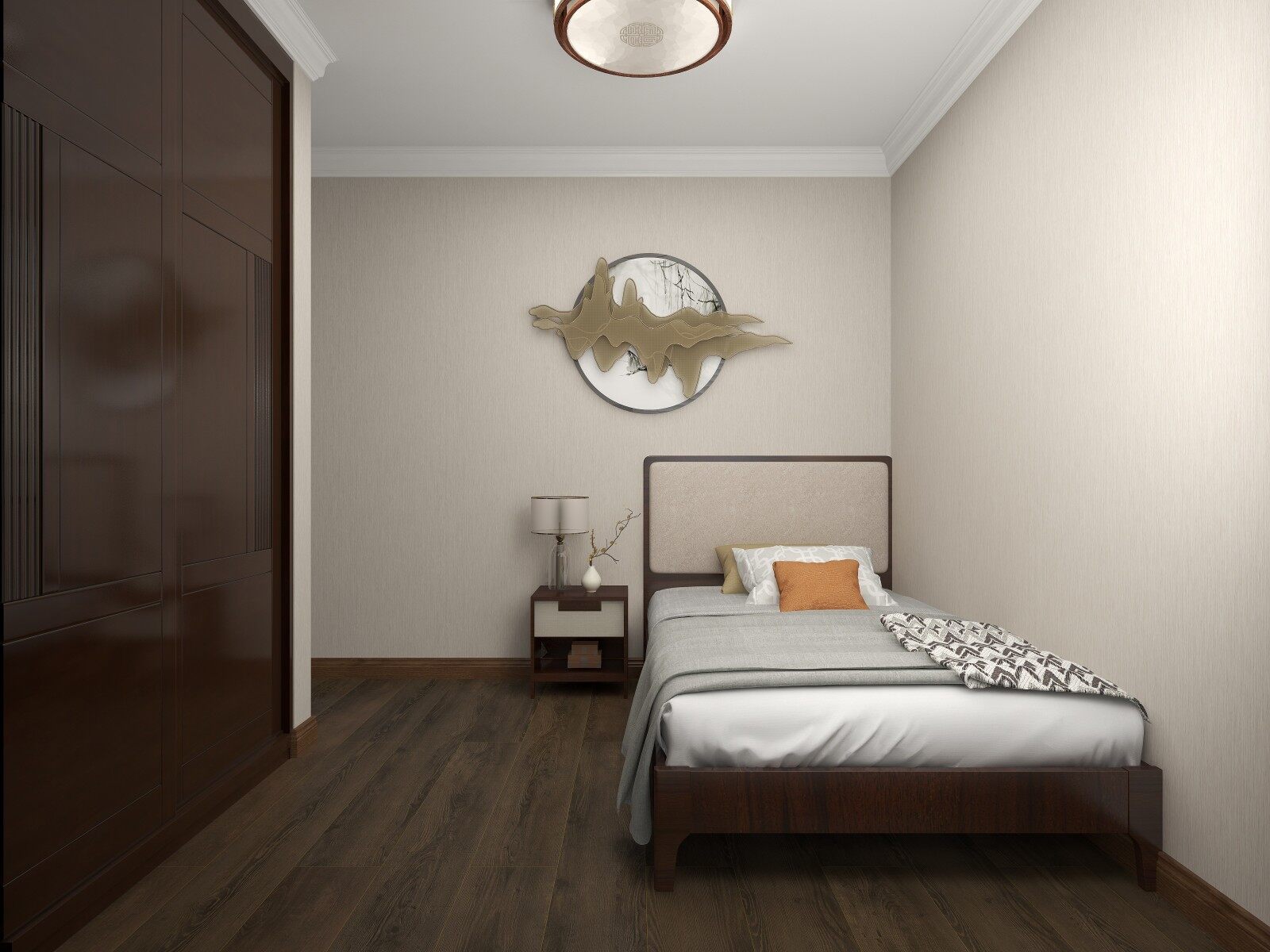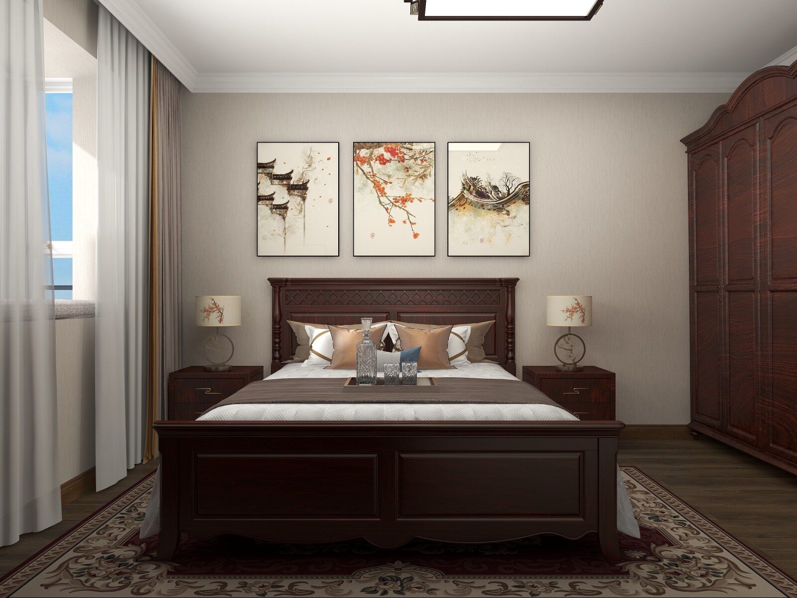 主卧以风韵浓郁的壁画和床具来提升卧室空间的美观度,让中式风格的辨识度更高!清雅又浑厚!
