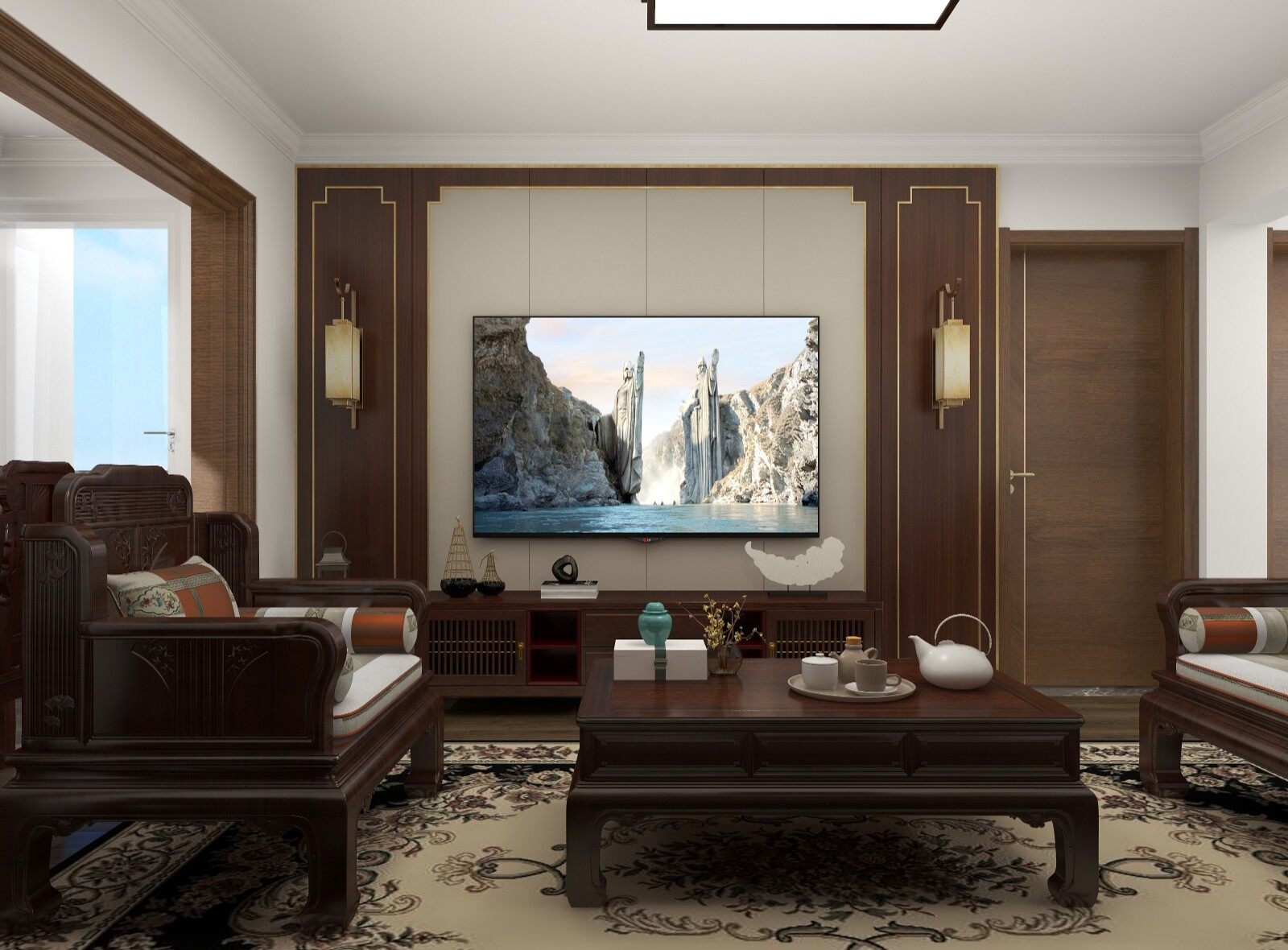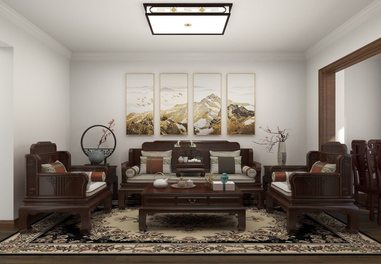 根据业主的需求,扩大了客厅的面积,足以放置一些实木家具!浓厚的新中式风格,悠然山水,心之向往!