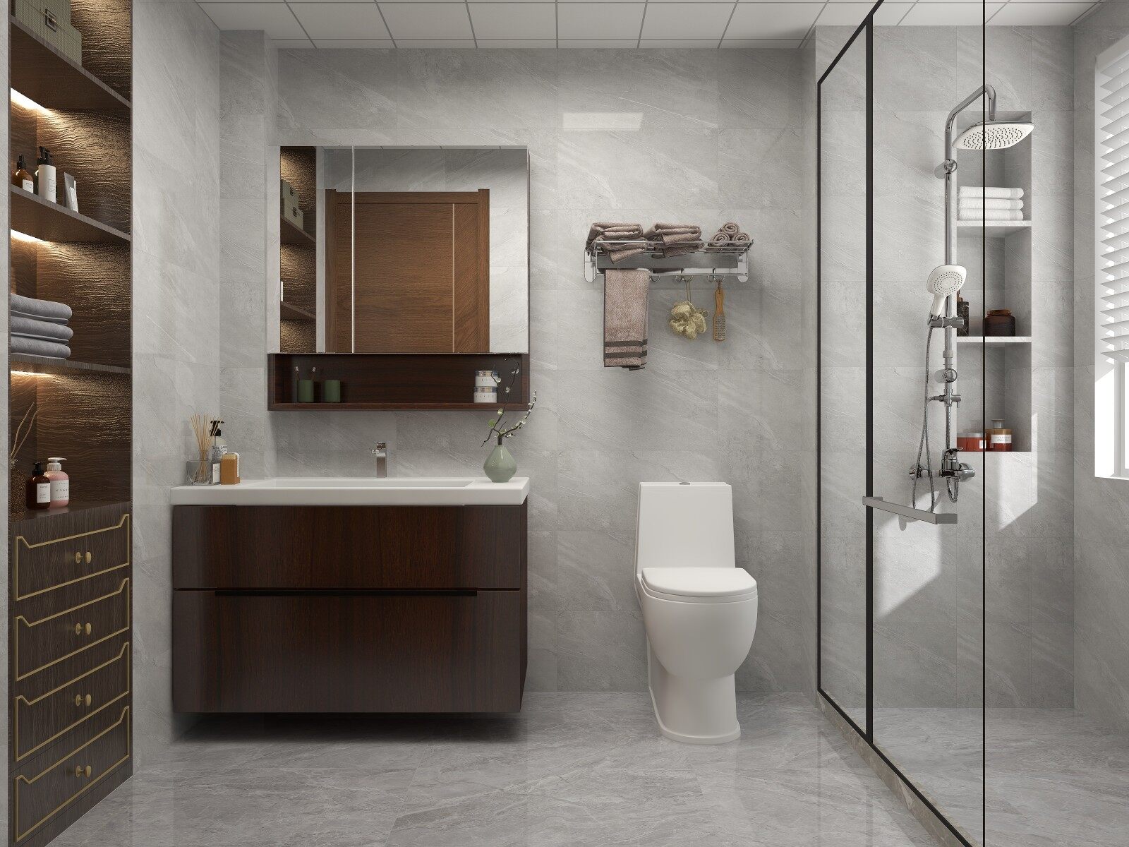 卫生间设置人性化考量的干湿分离,将雾气都控制在湿区,保证干区的卫生干净,同时增加储物柜,提升收纳实力。