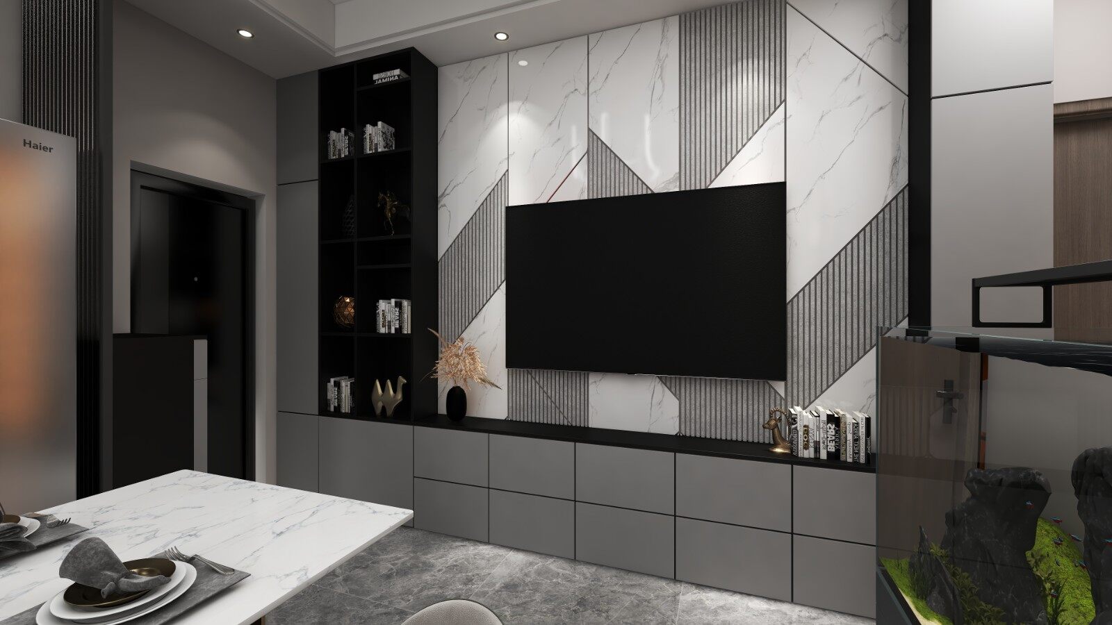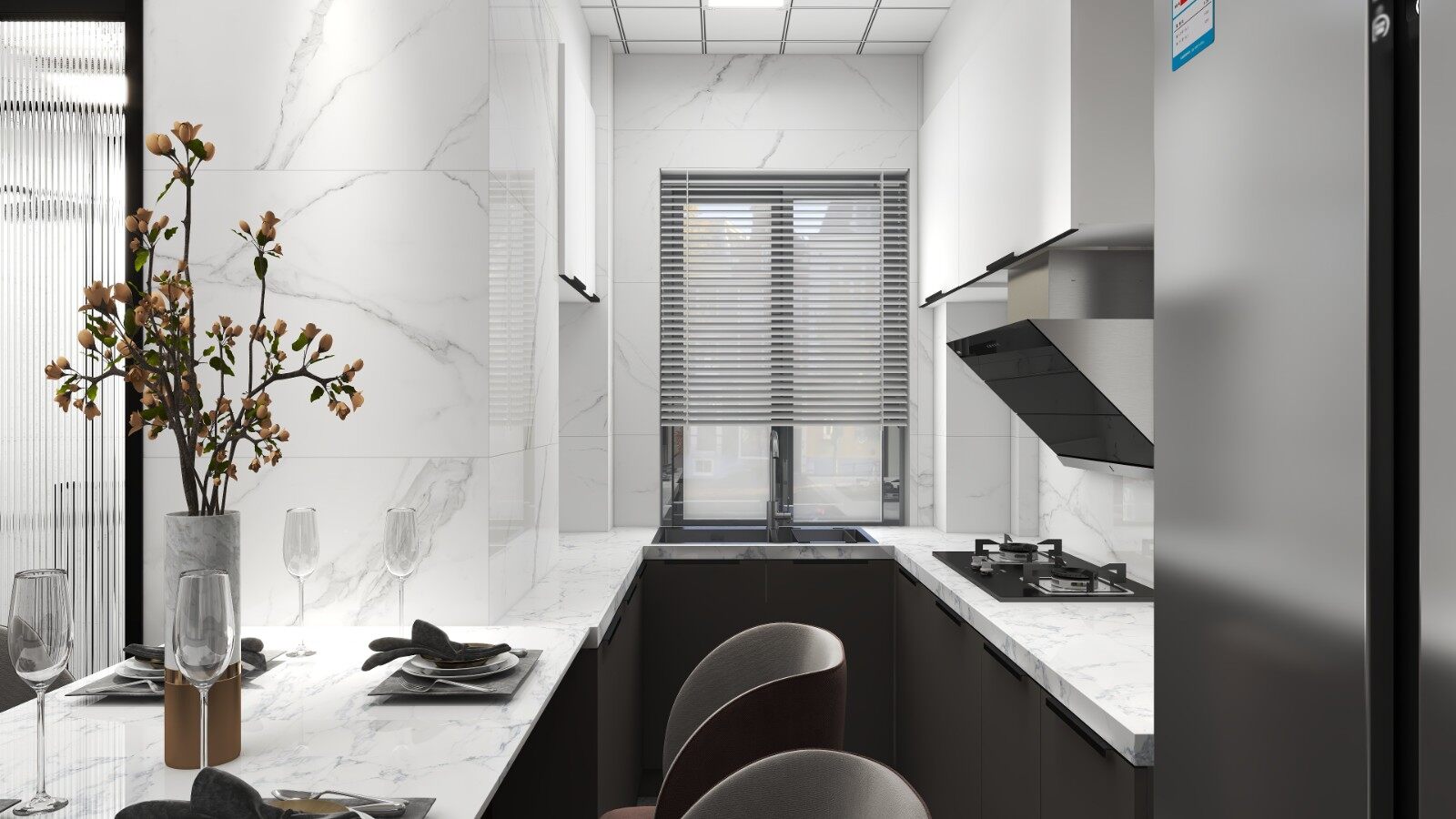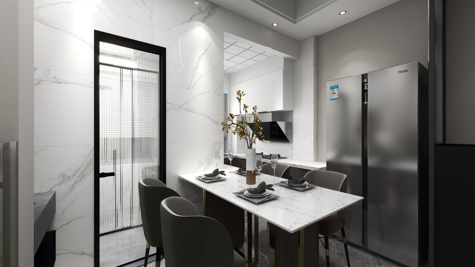 餐桌与开放式厨房相结合,促进家人互动交流,提升居家幸福感。大理石的餐桌更具现代感。