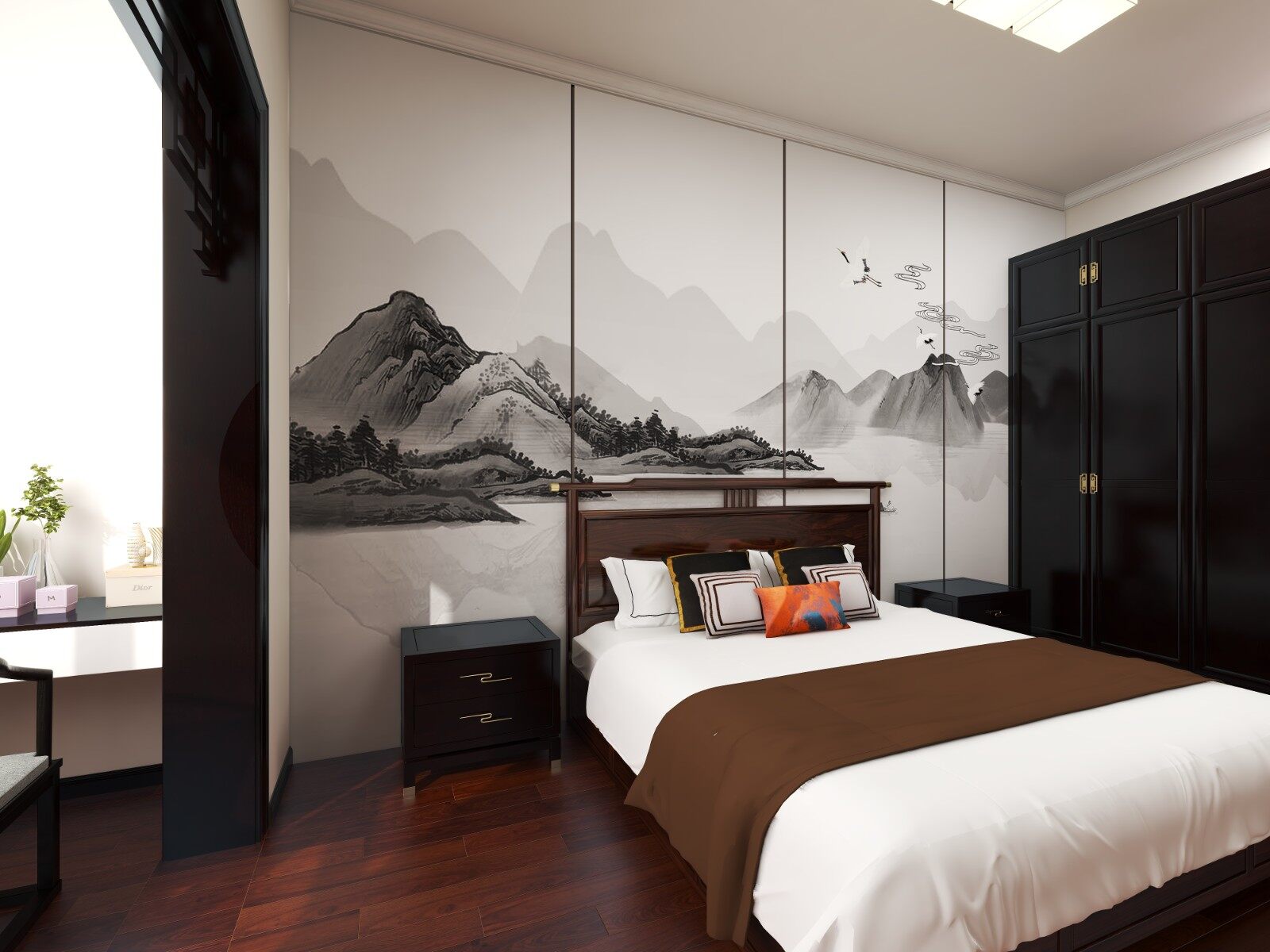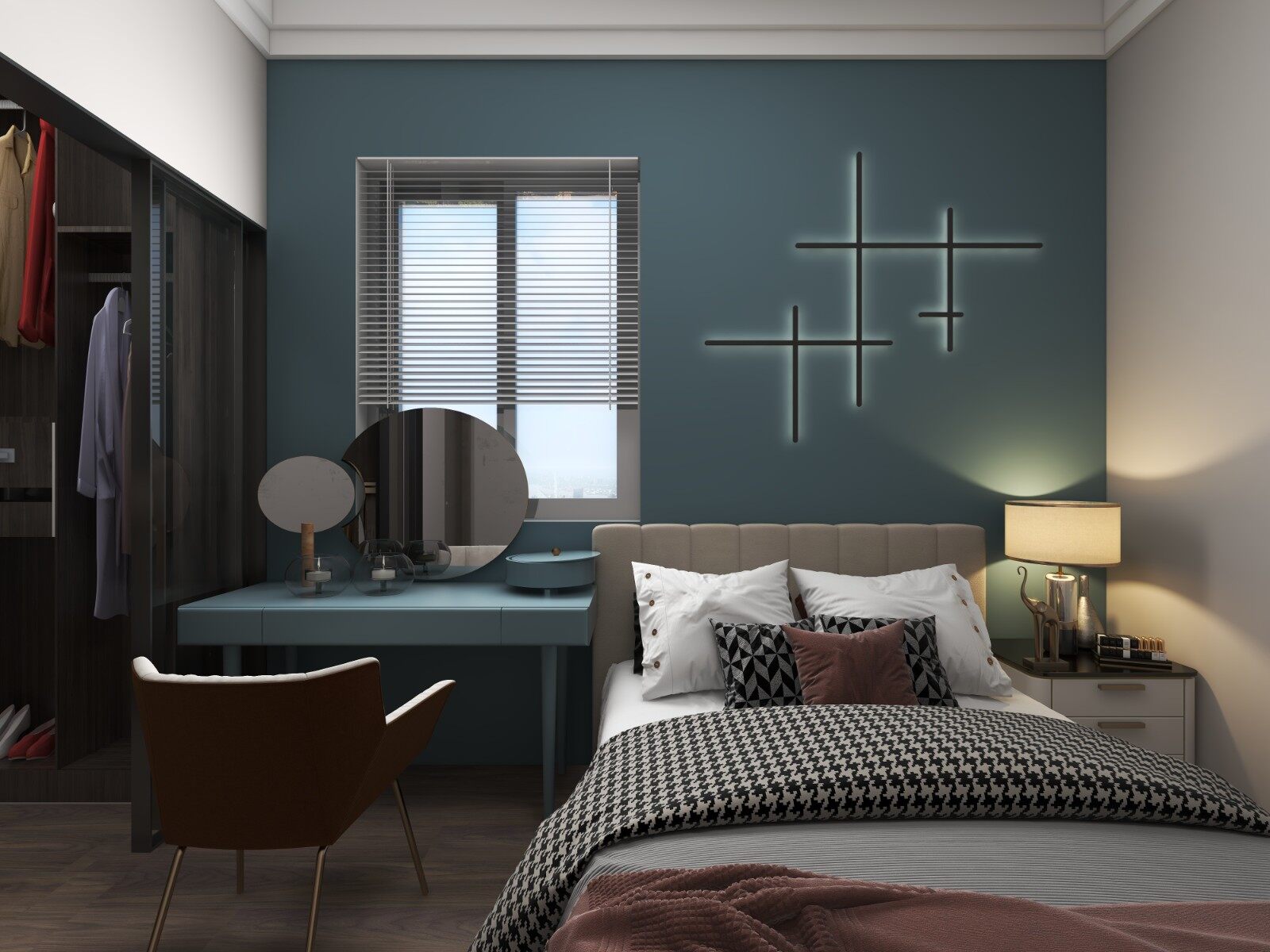 主卧摒弃非必须的电视,为女主人规划了梳妆台,形成独立的化妆空间。靠边放置一字型衣柜,满足收纳需求。卧室功能明确,用色温馨,整个空间简约大气