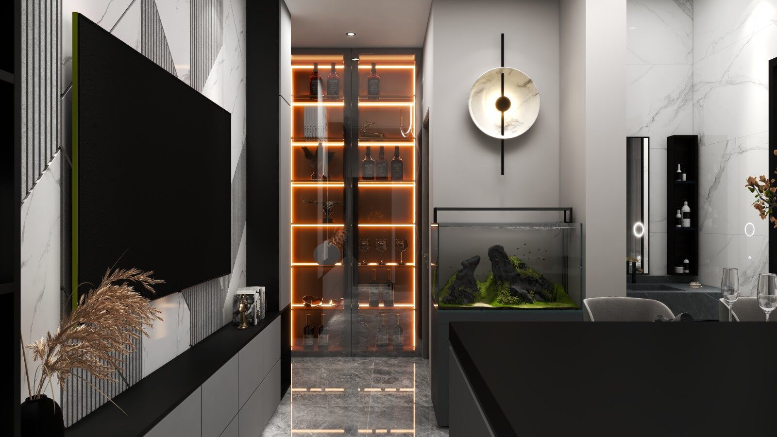 客厅空间以现代感软装为主来打造风格,同时设置透明玻璃的储藏柜,便于业主放置一些酒品以及藏品!