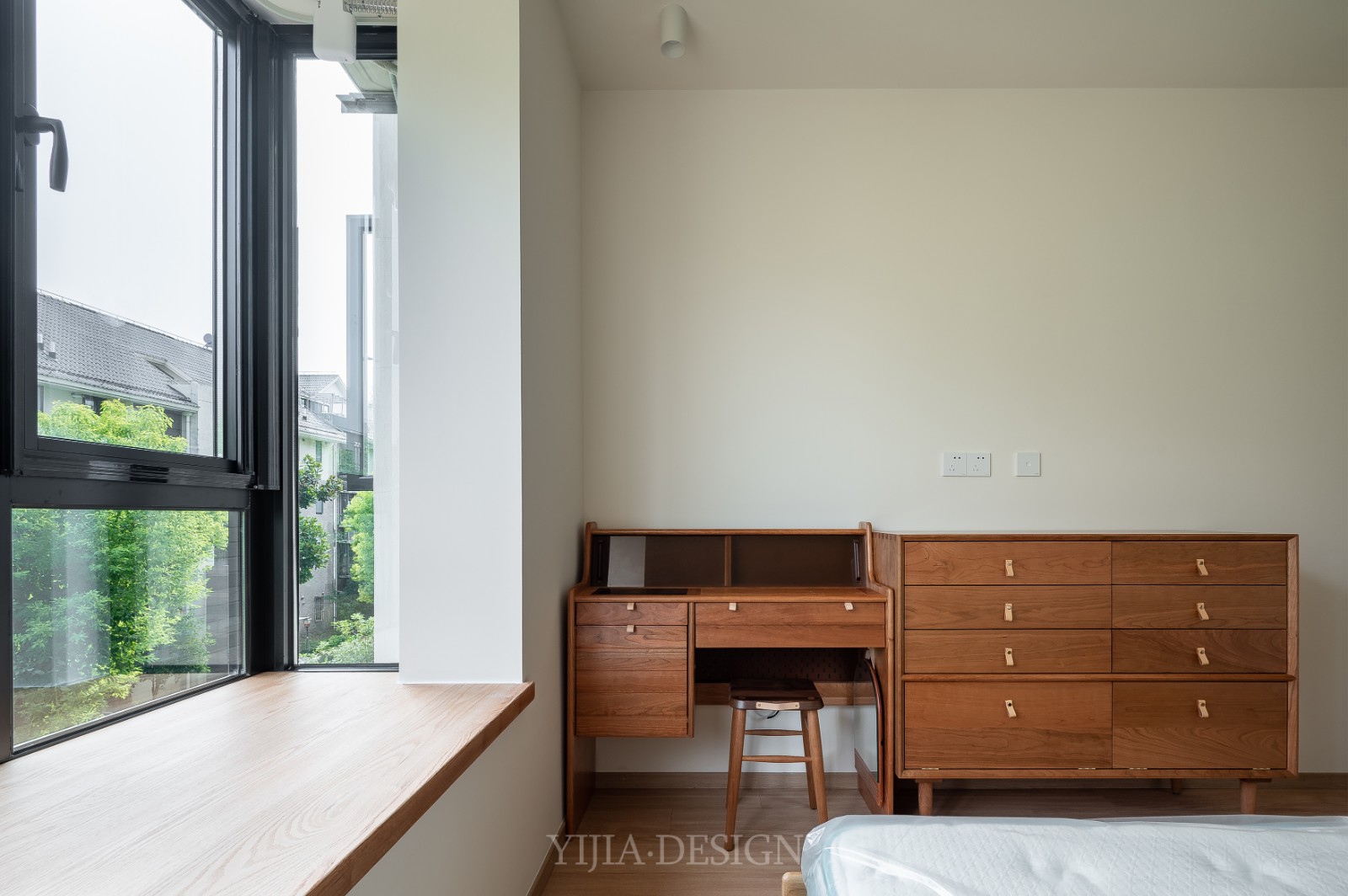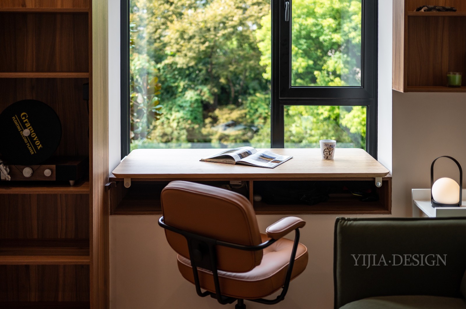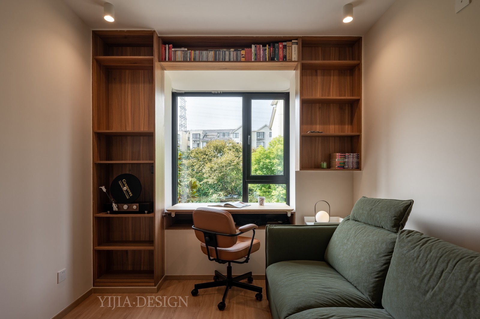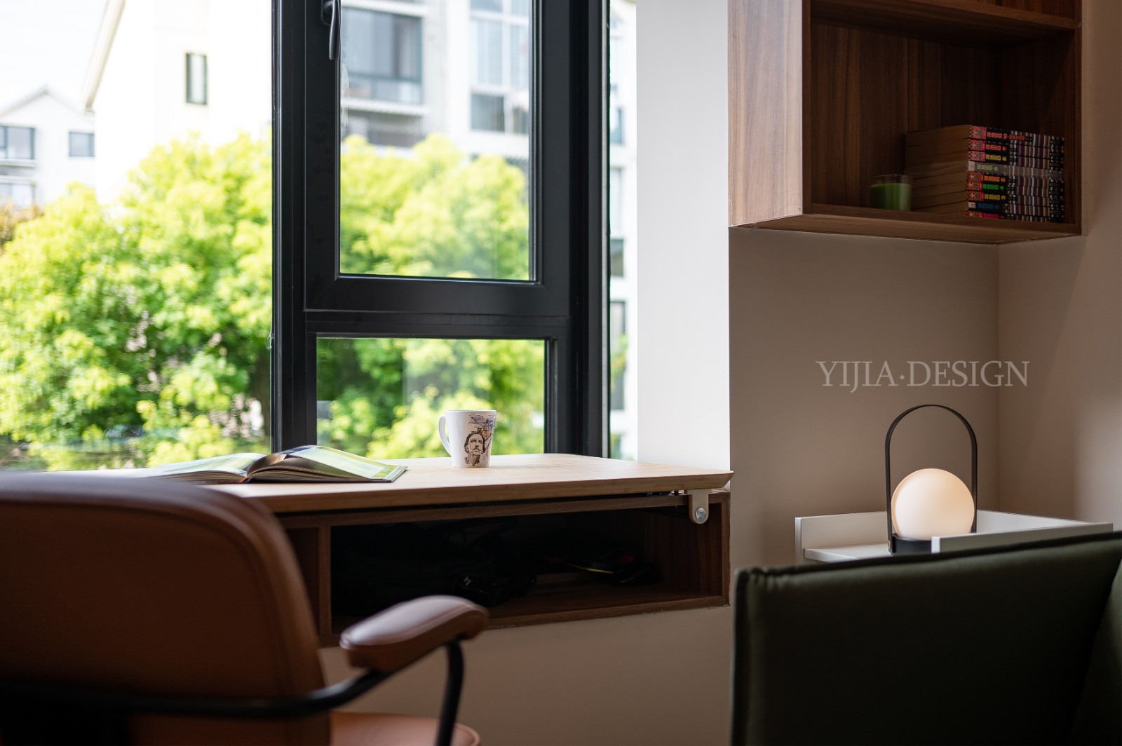 原木色的书柜一点都不压抑,反而多了自然的生活气息。充分利用飘窗的位置,变成可收缩的书桌,当工作完或者学习完,静静地看看窗边的风景,简直是太美好的生活了。