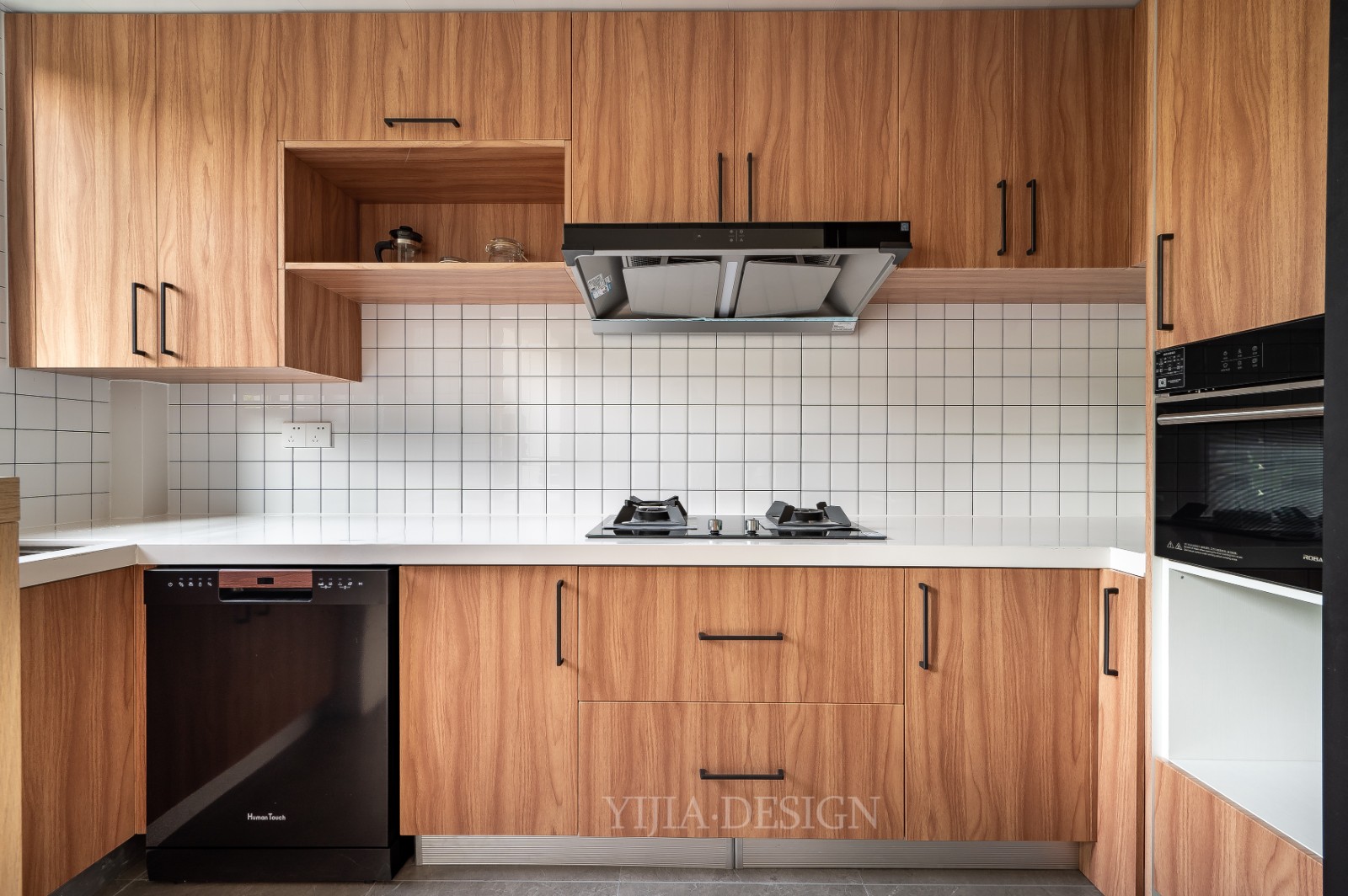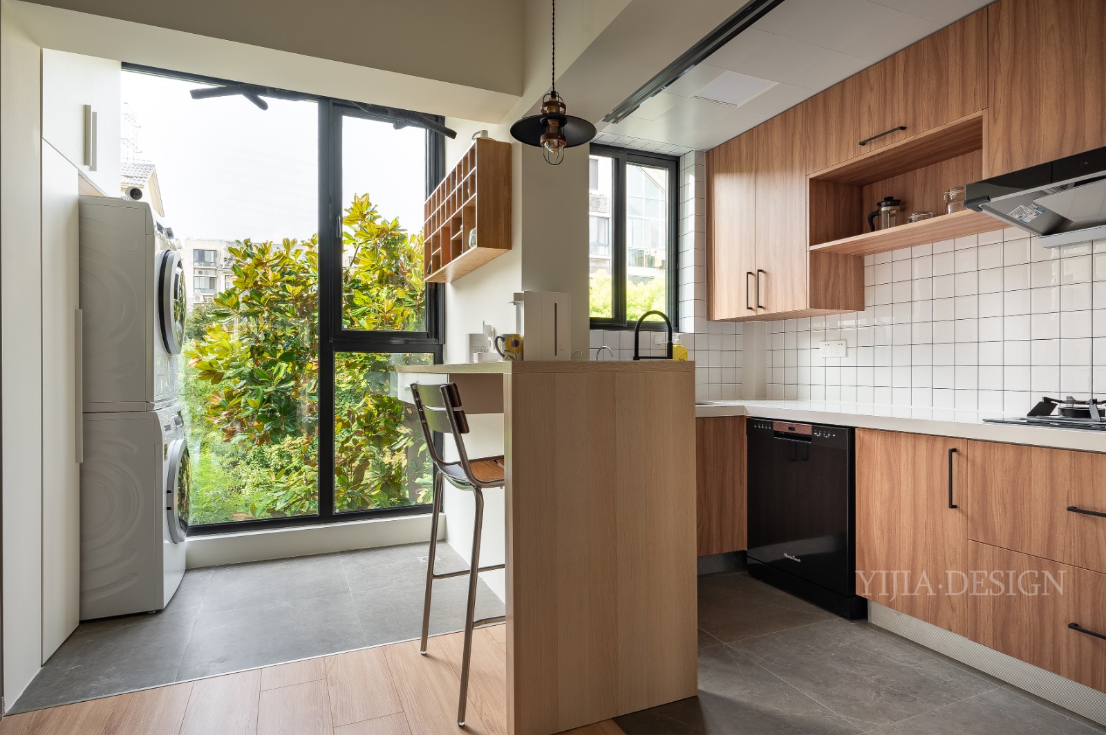 干净又明亮的开放式厨房,墙面是哑光的小格子瓷砖,简约又好打理。多功能的组合橱柜,解决了多种收纳需求。