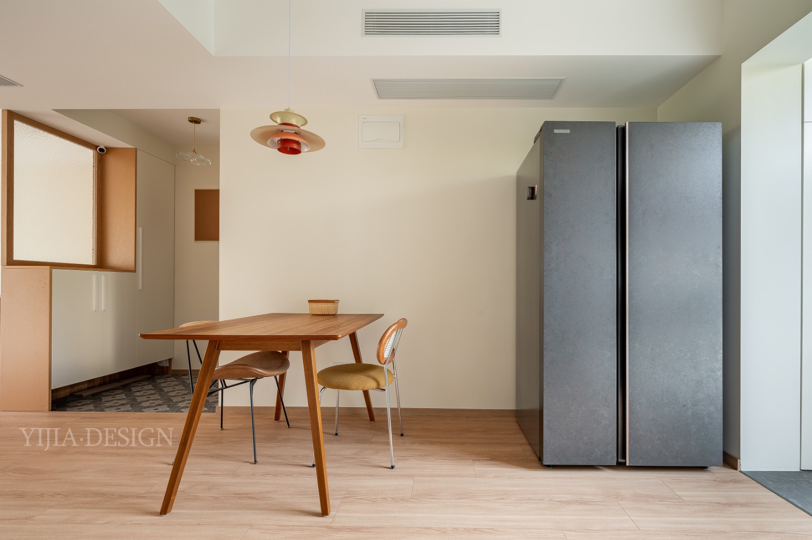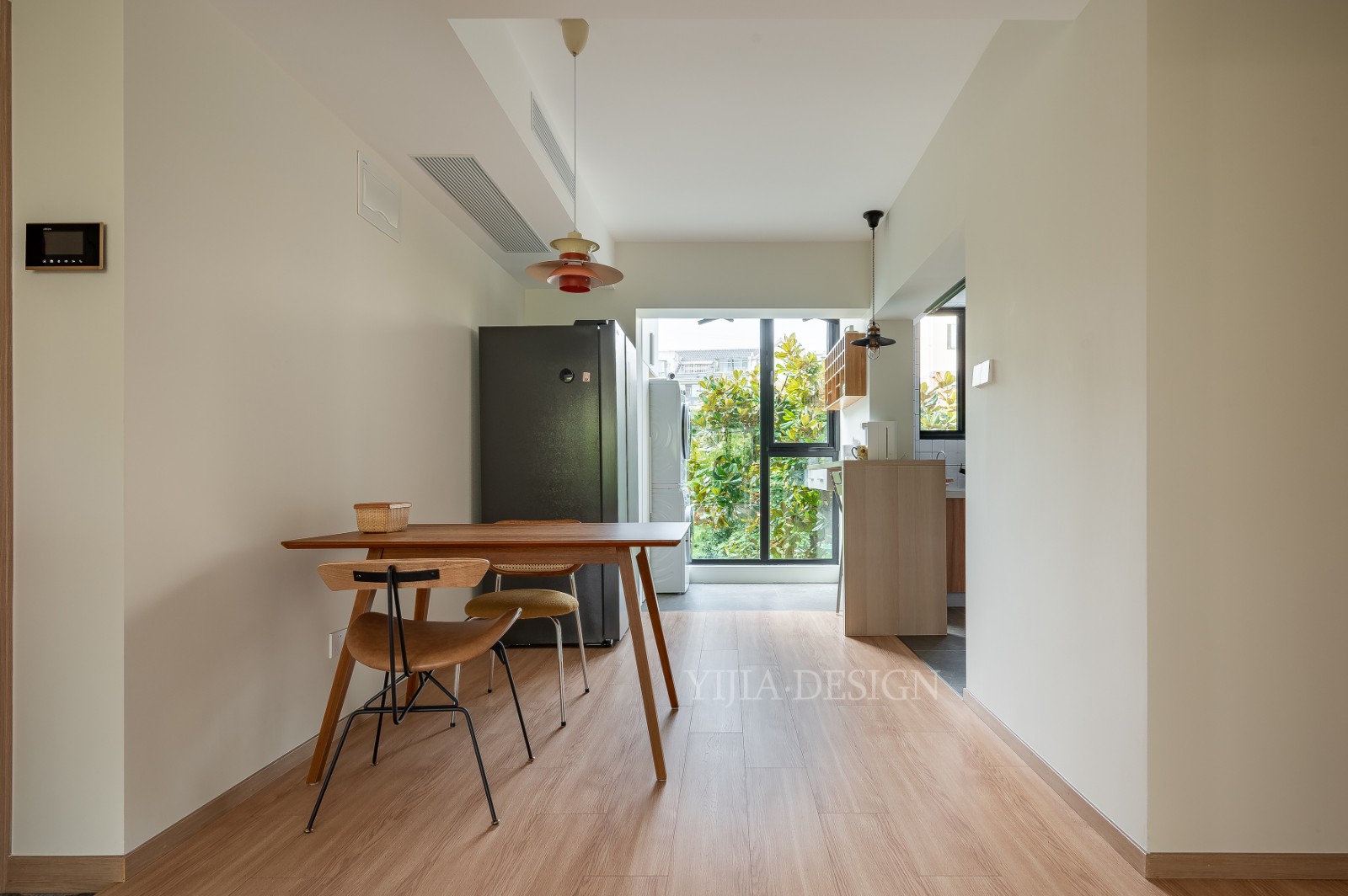 开放式的客餐厅设计,缩短动线,与客厅融为一体。餐厅的面积比较小,但一张简单的原木桌,再加上氛围感十足的吊灯,瞬间餐厅变得温润又美好。