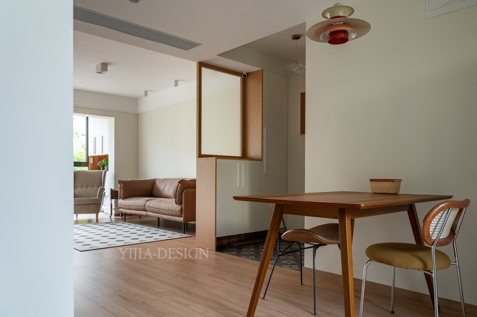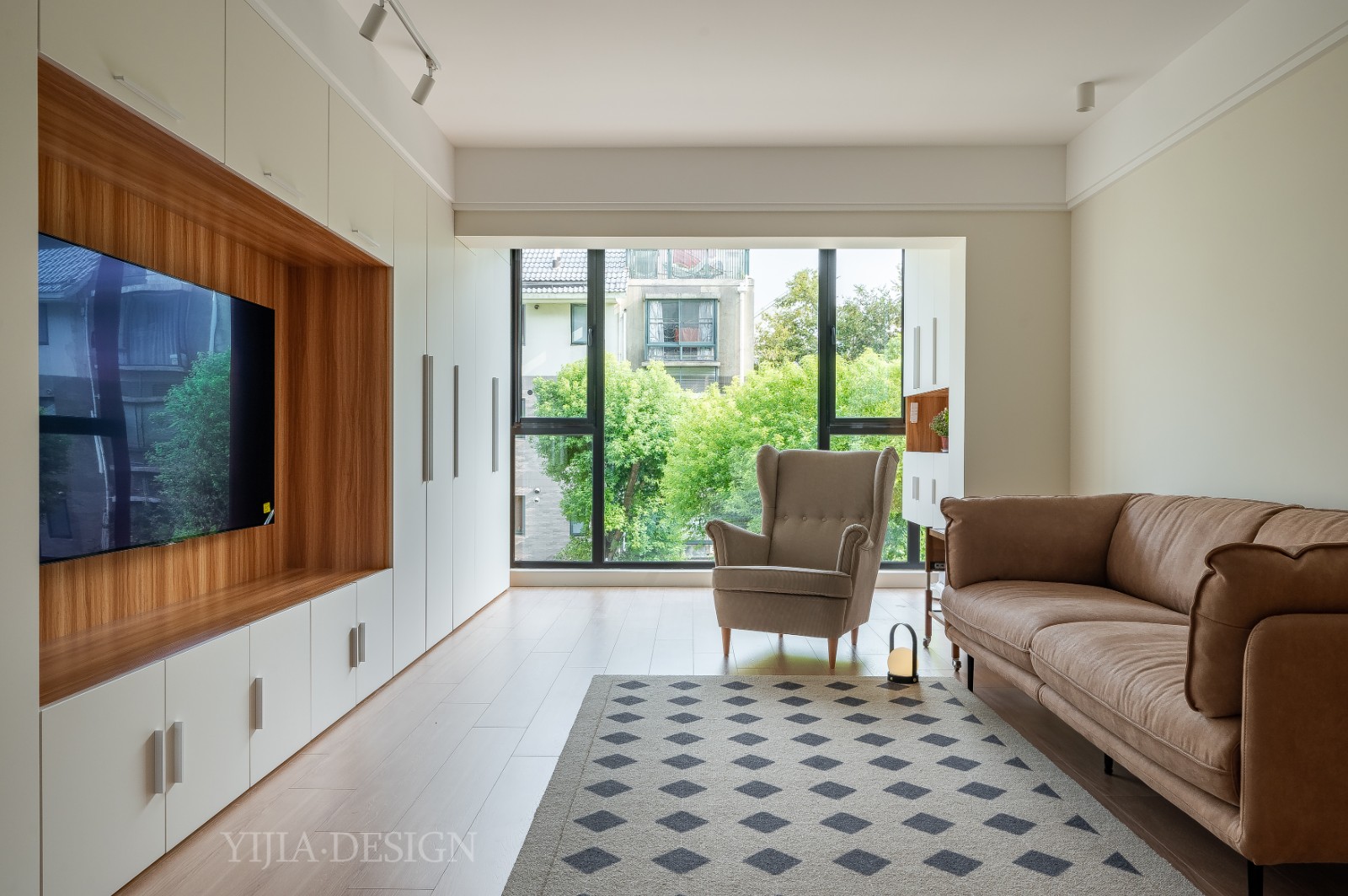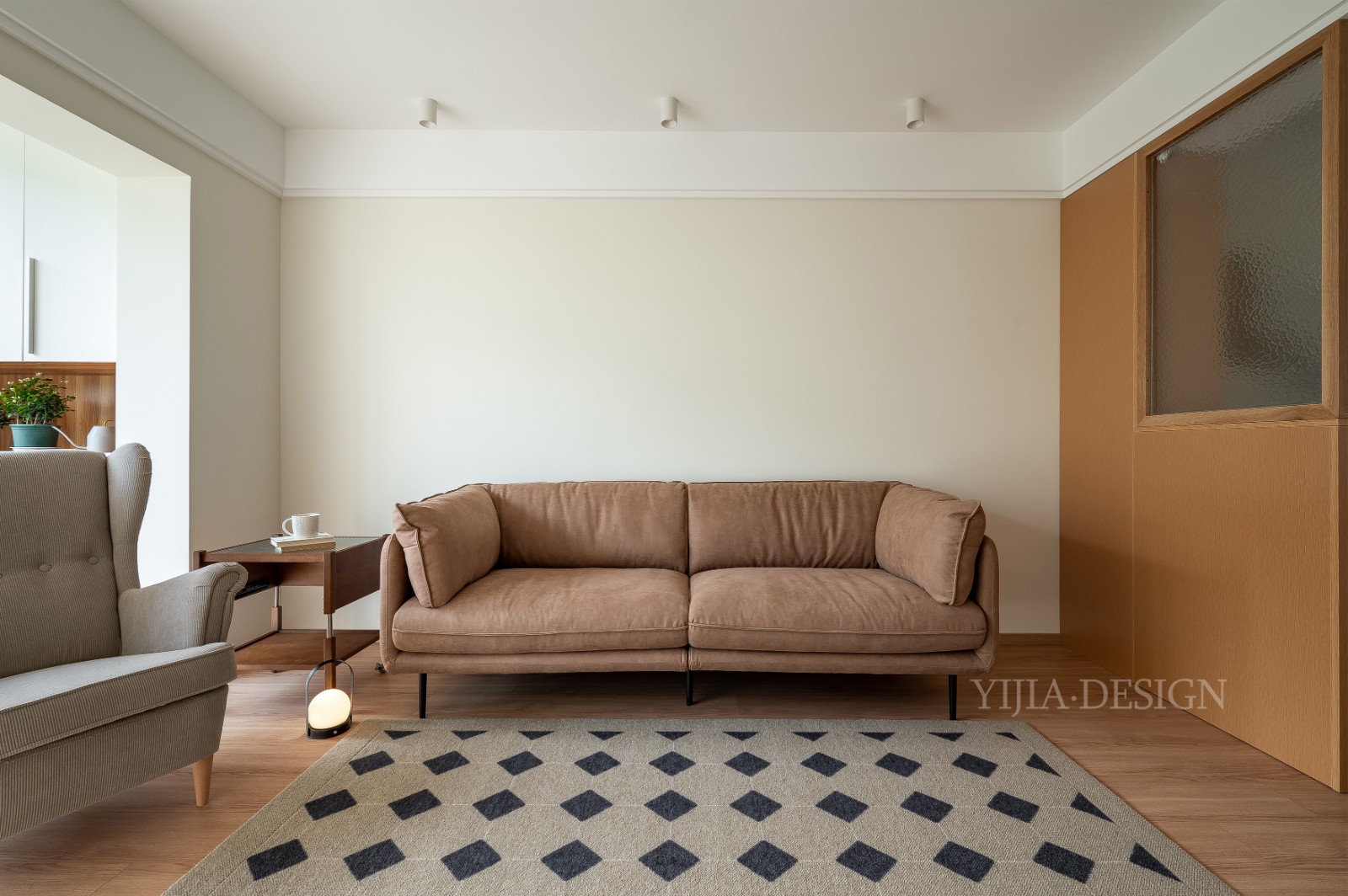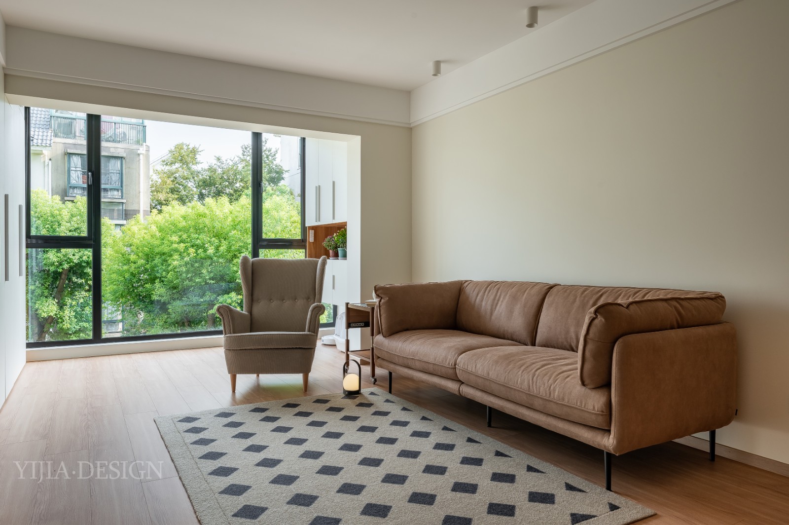 客厅并没有选择像以往一样,选择传统的茶几,而是一张软糯的沙发,和米色的单人椅,让客厅的重心回归到与家人之间的互动。