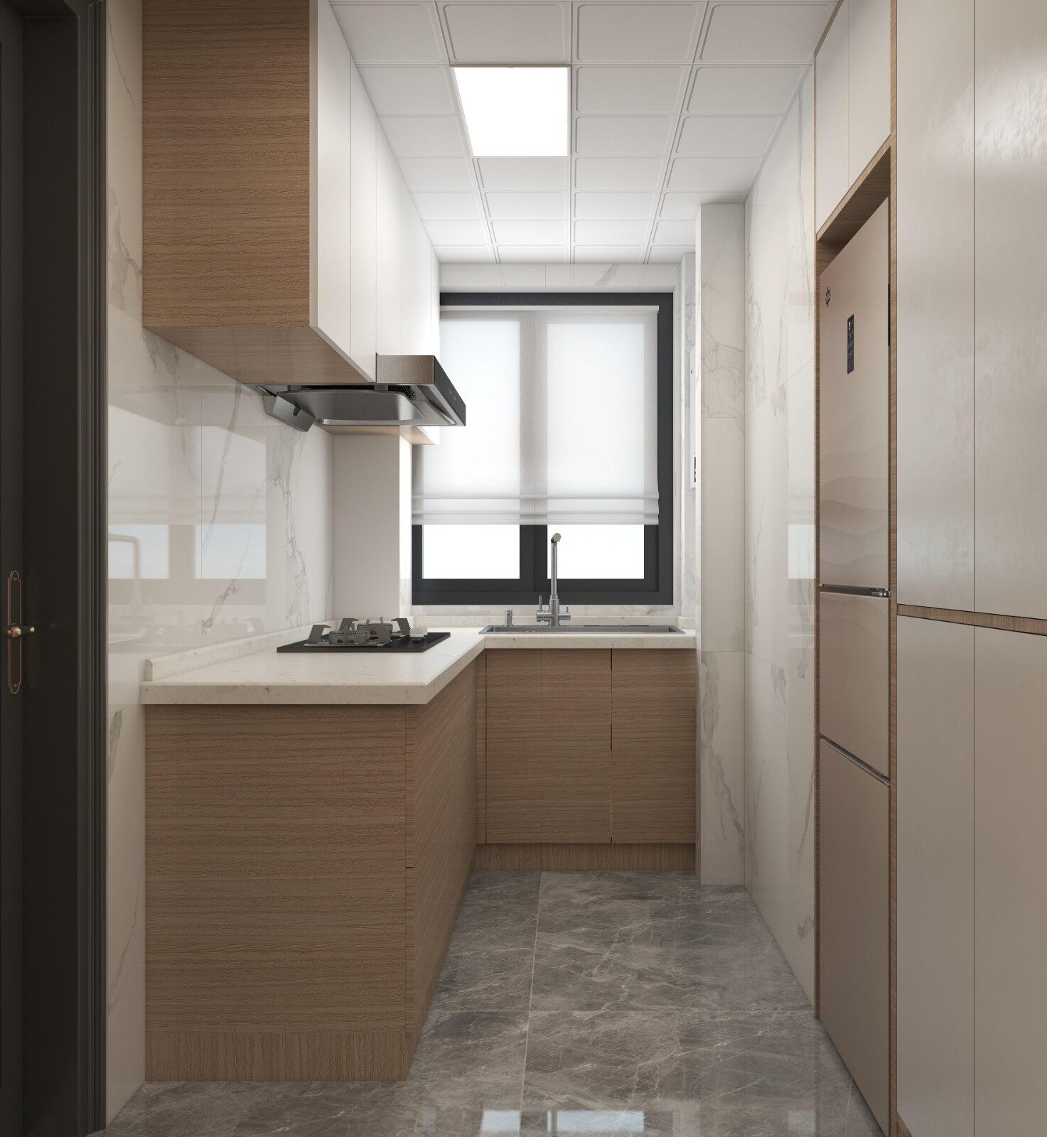 厨房保持原有格局不动,但是橱柜与墙地砖的材质颜色以白色吊柜以及墙砖为基调,考虑到冰箱的位置。