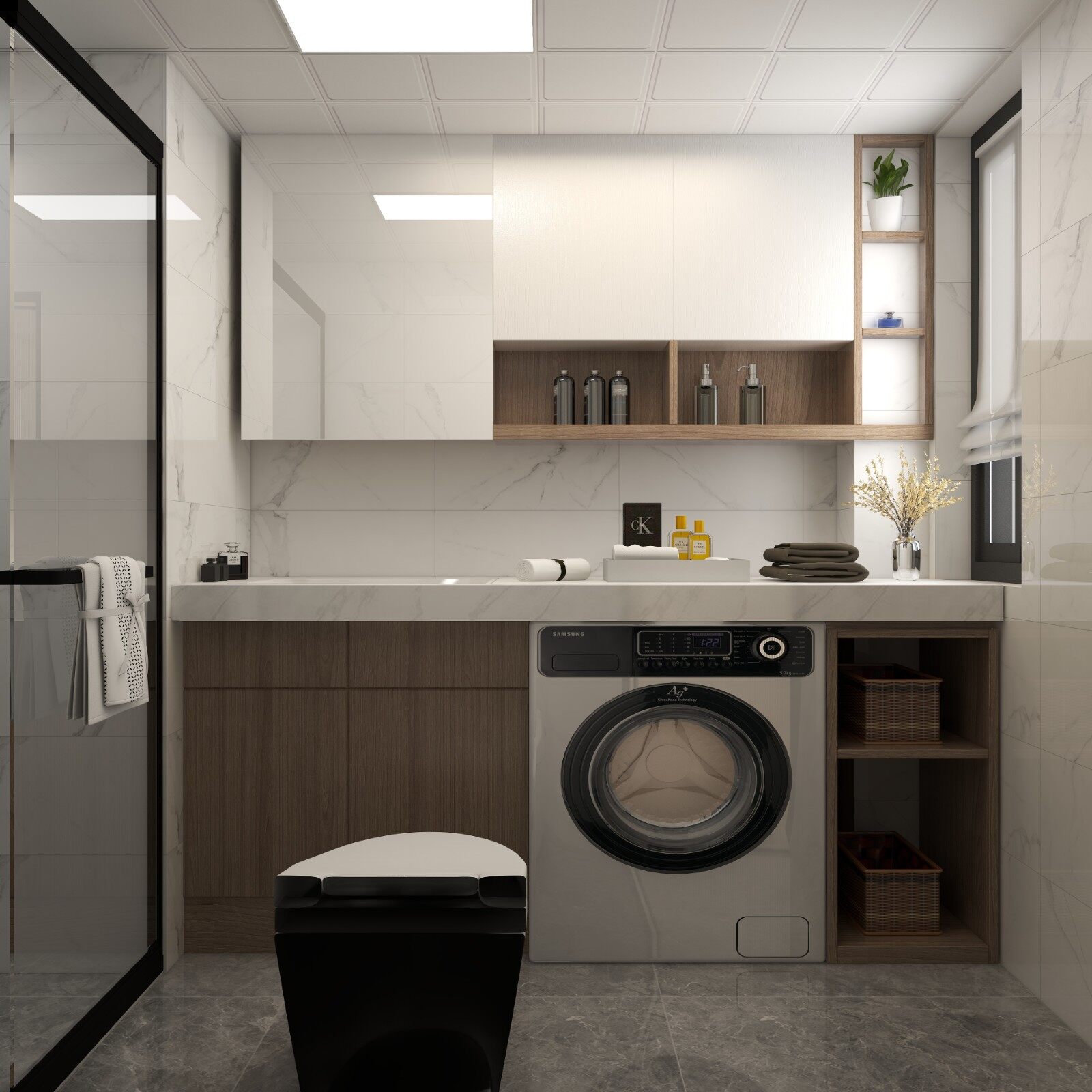 卫生间和之前的储物间打通,增加卫生间的使用面积原面积变大,洗衣机放在卫生间,提高使用效率。