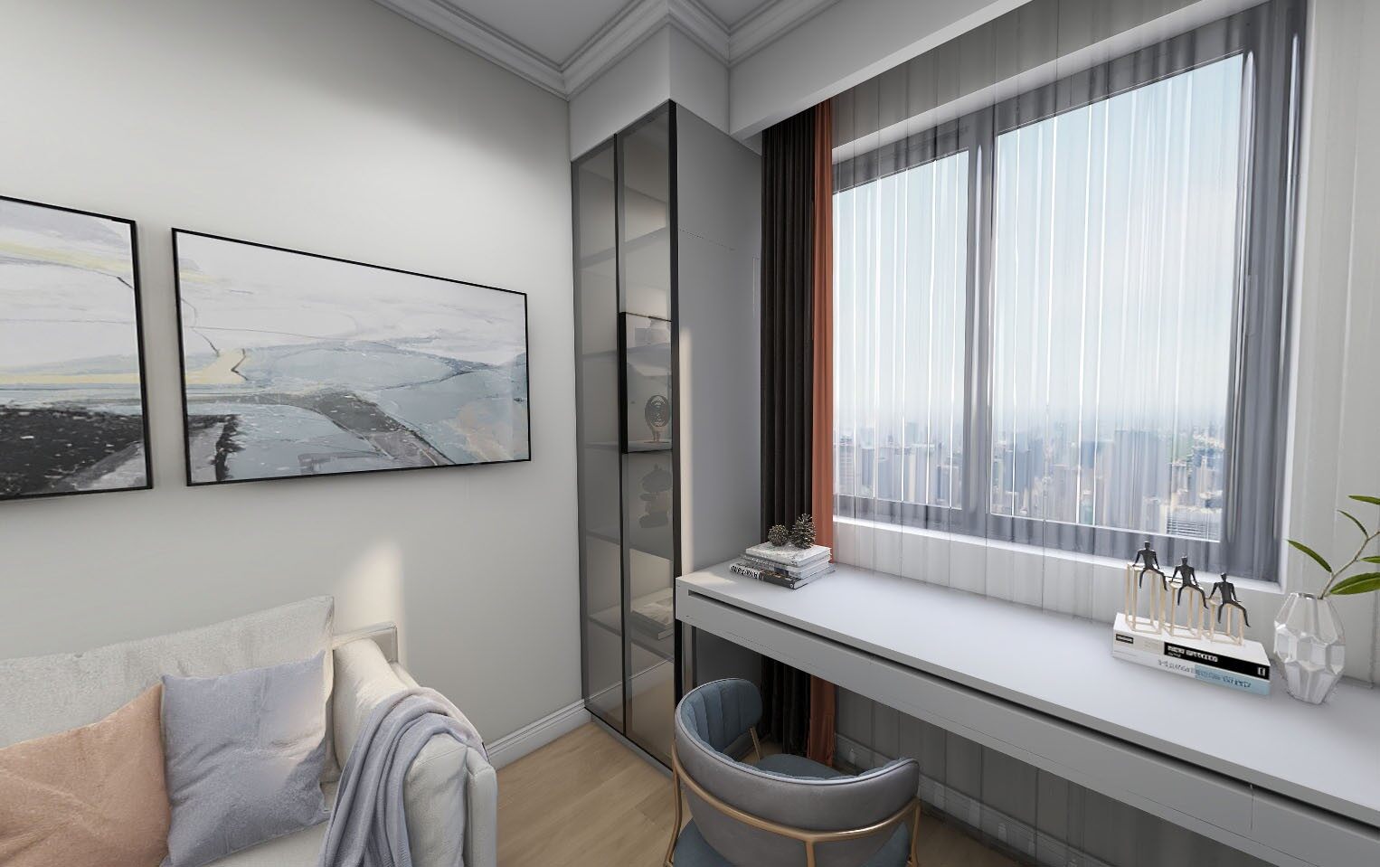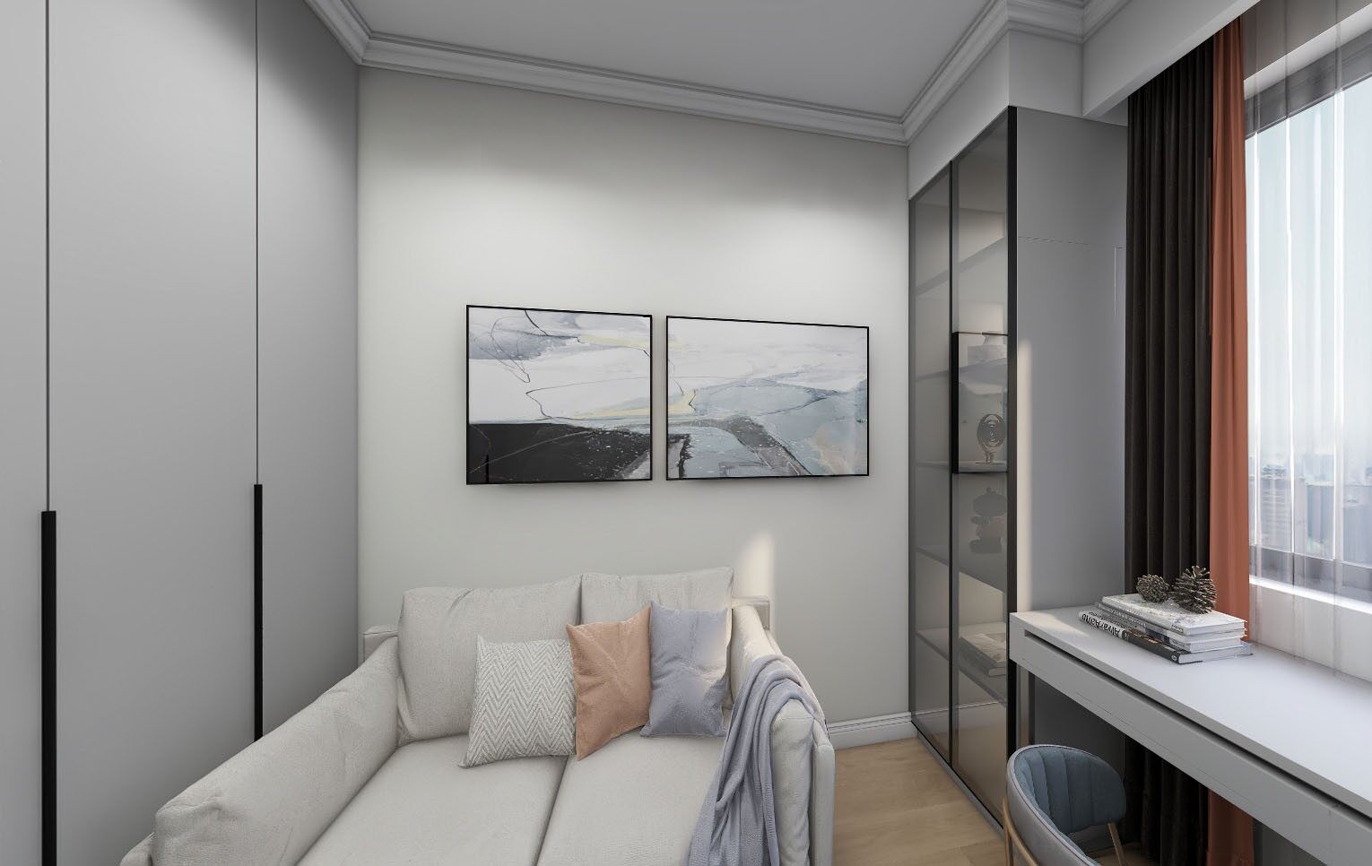 书桌旁设置收藏柜,方便业主放置书籍藏品等等!搭配时尚挂画让空间的艺术气息更加浓厚~