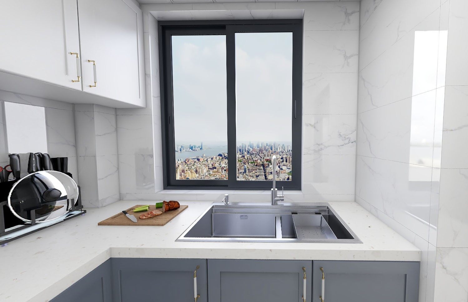 厨房设计U型充足操作台,烹饪处上方吊柜做白色处理,不压抑,下柜深色,增强空间厚重感~