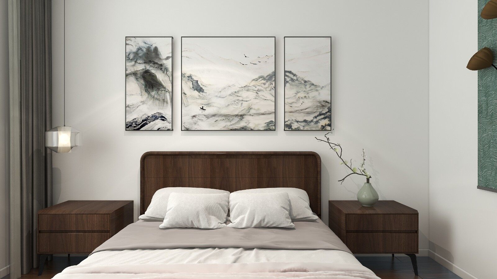 卧室的风格迎合业主的审美,以新中式风为主,融入山水壁画,体现卧室不凡的调性。
