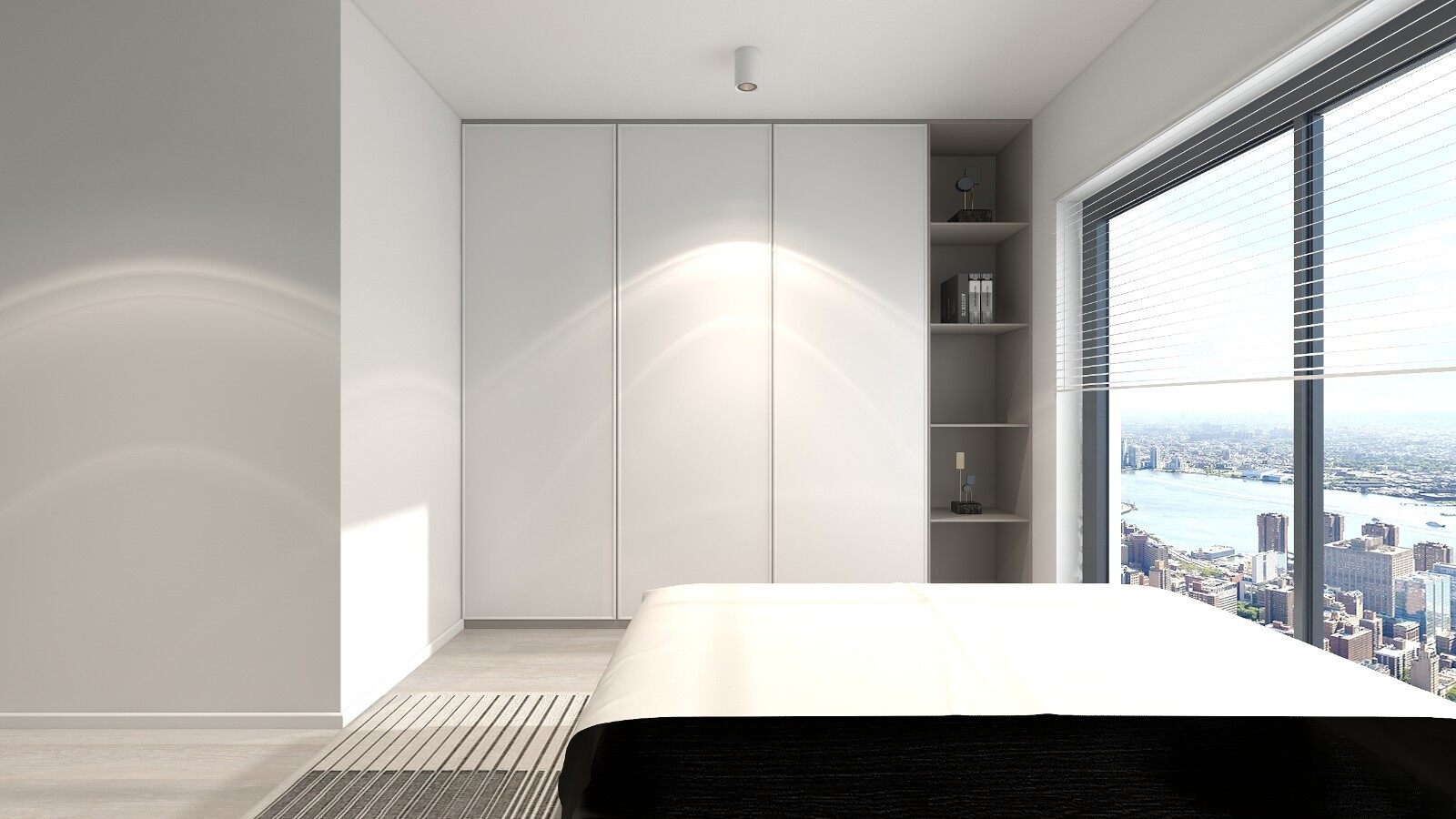 主卧以沉稳经典的黑白灰为主色调,并且外扩一部分区域设置为书桌飘窗柜一体,既保证休息功能,又满足办公休闲使用。