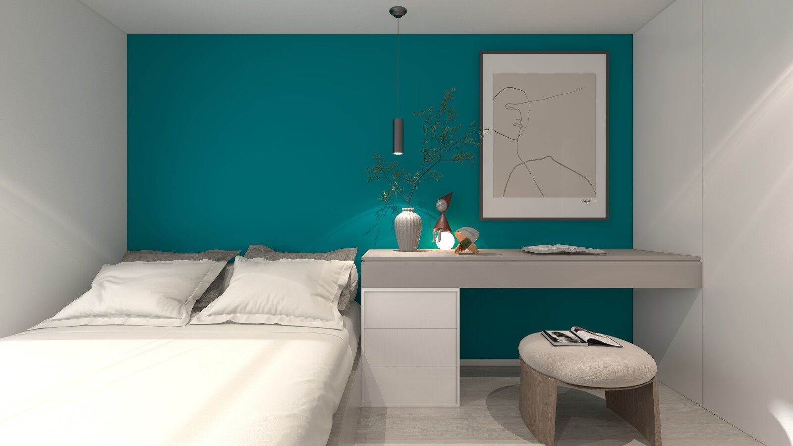 主卧背景大胆运用高贵的孔雀绿,让空间气质更上一层!搭配艺术挂画和绿植,提升空间美感!