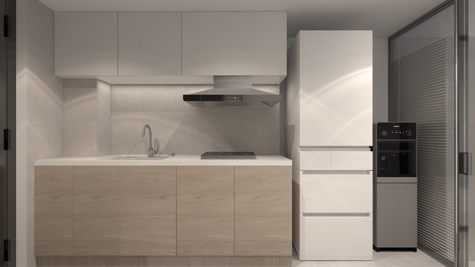 因为厨房面积有限,所以将设置为常规的一字型操作台,冰箱挨着台面,方便业主取菜洗切炒。