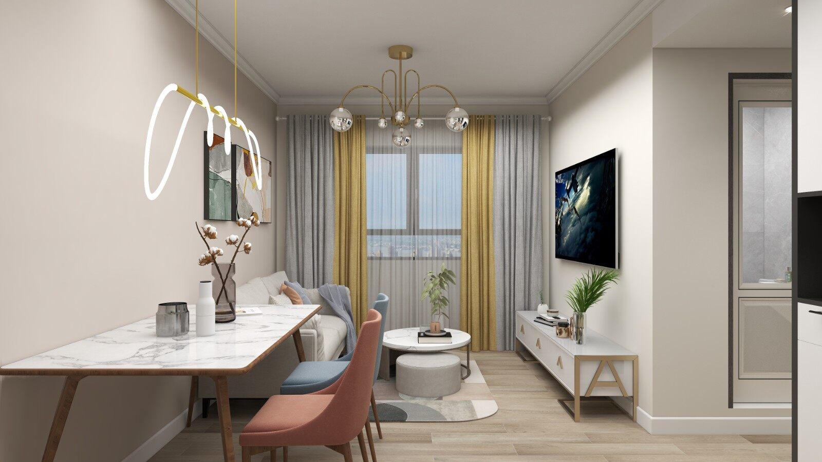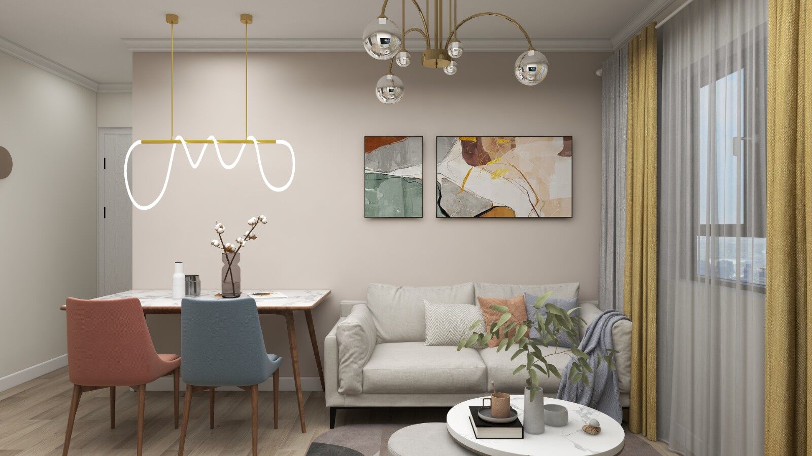 整体以经典的灰色为主色调,搭配低饱和度的黄红蓝色来提亮空间,再融入个性灯具,让空间充满艺术气质。