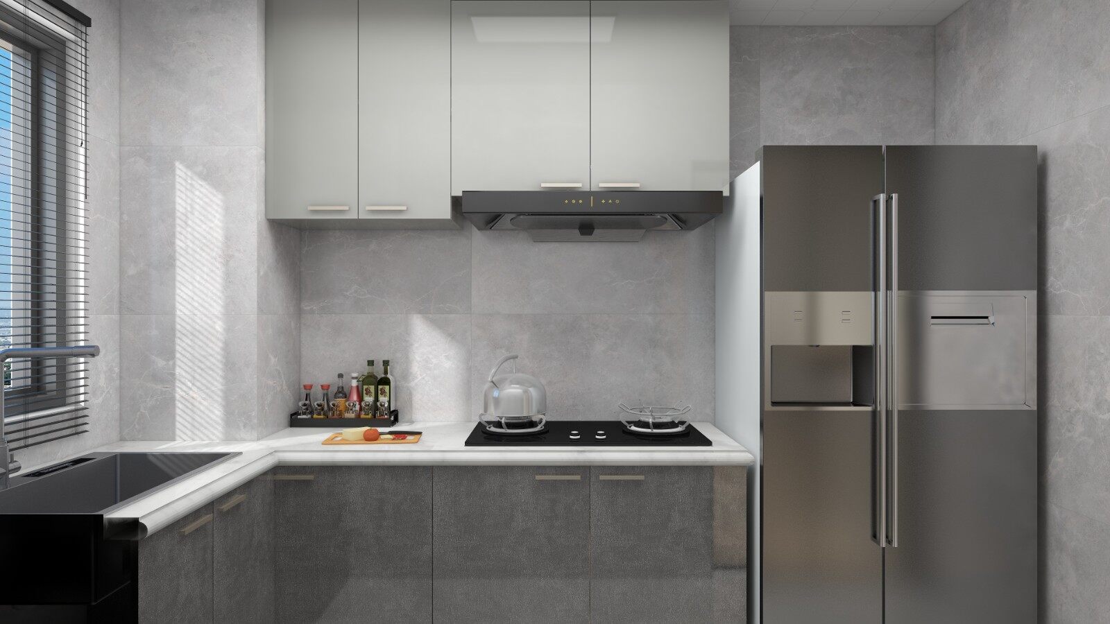厨房橱柜与墙地砖的材质颜色以灰色吊柜以及墙砖为基调,灰白色地面为辅通铺至客厅,尽显年轻活力。