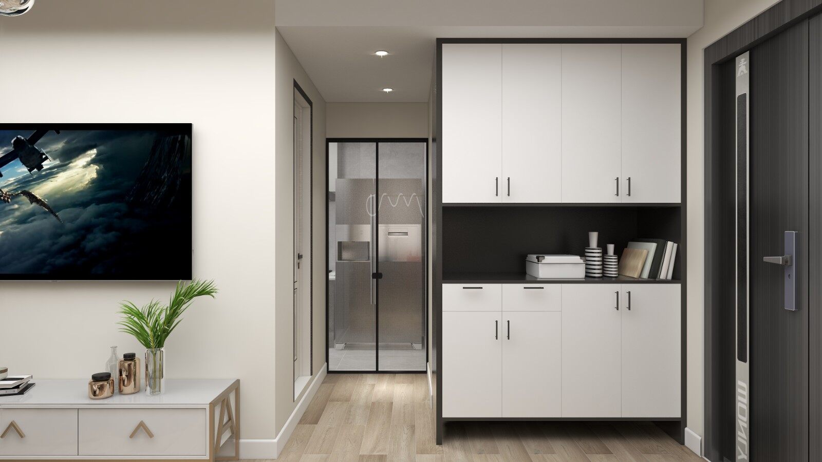 由于会客厅空间有限,所以玄关设计了一个简约式鞋柜,不影响出入活动,也具备了储物功能。