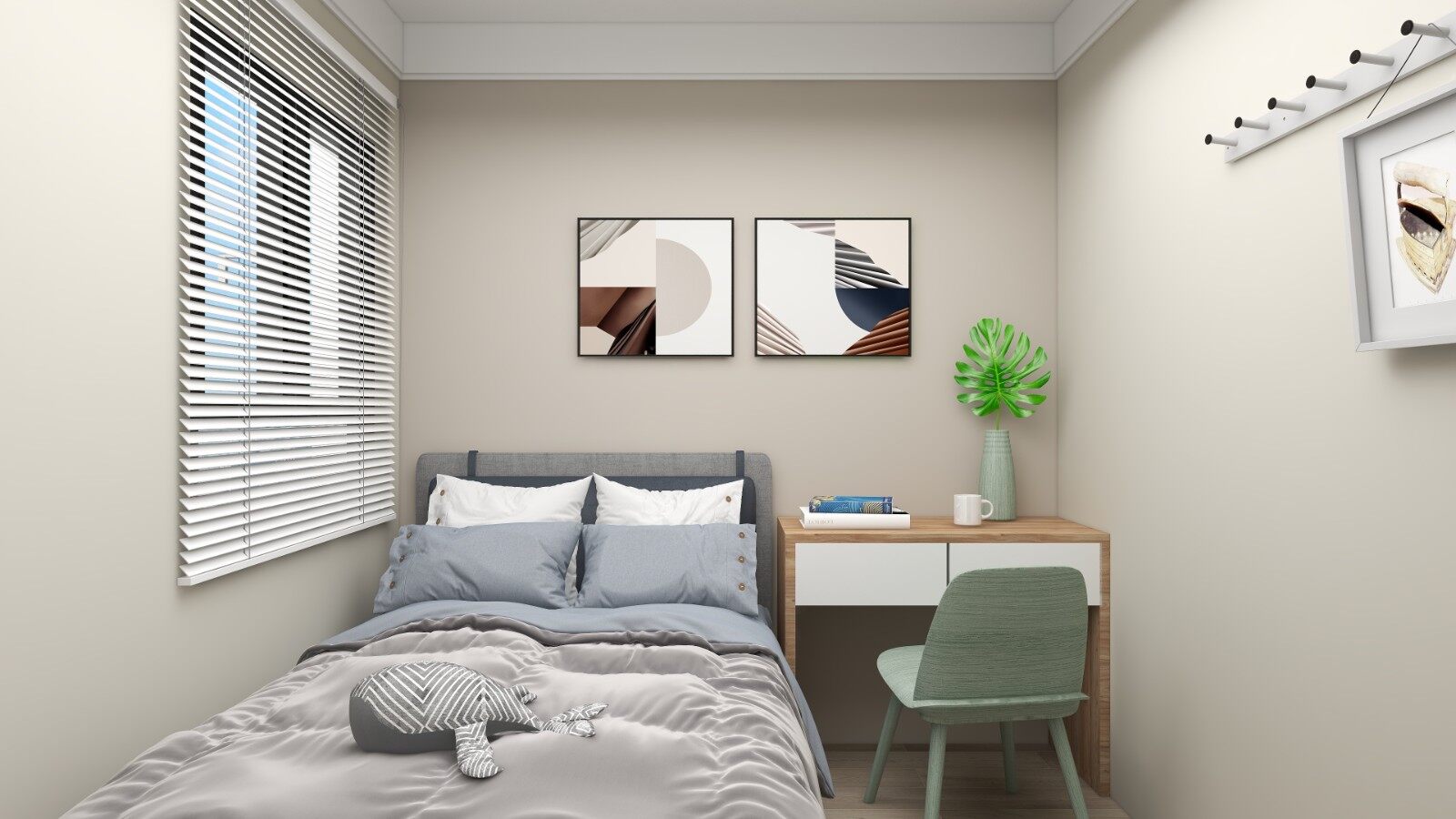 次卧作为另一个卧室,主要为孩子来使用,从设计上讲越方便越好,设计简单亮堂,提供学习空间。