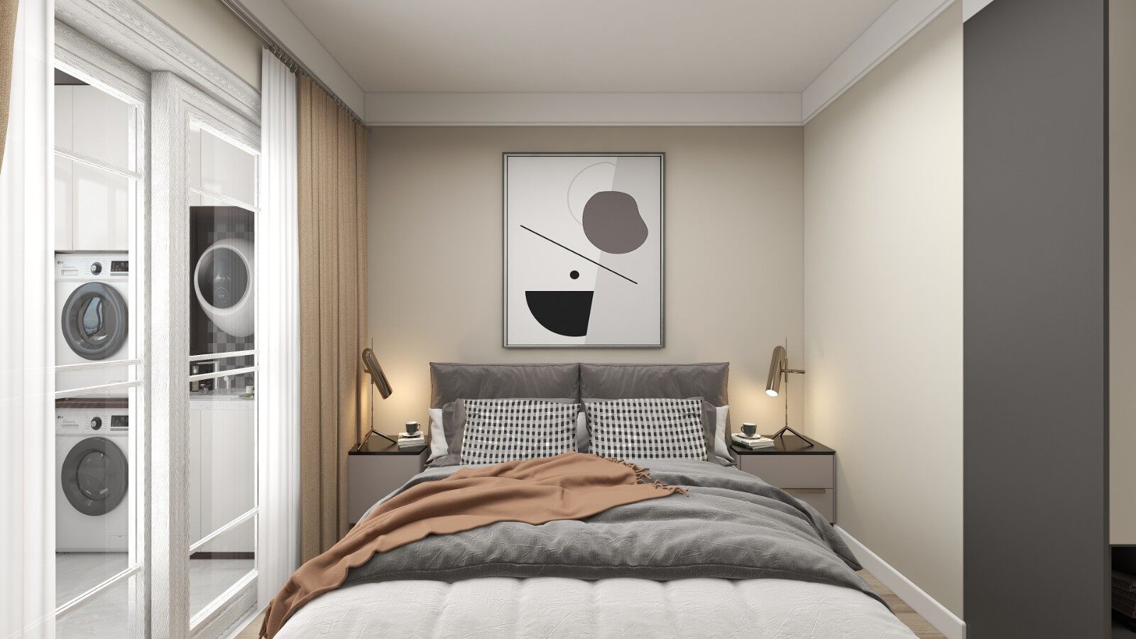 主卧是夫妻两个人居住,原本空间有限,在入室地方做了衣柜解决了占地问题。