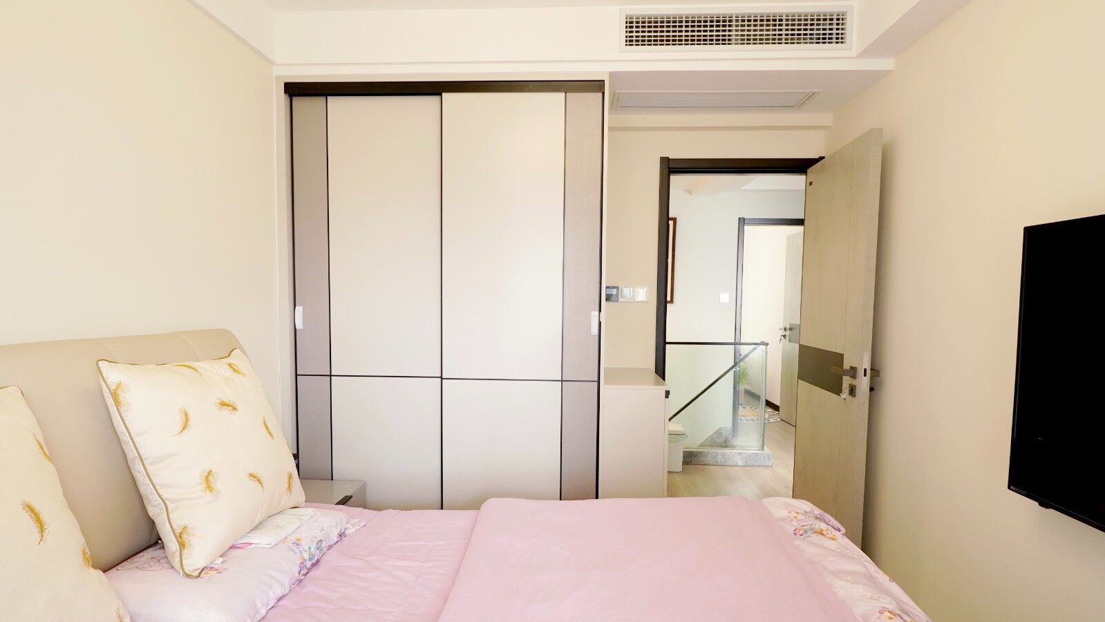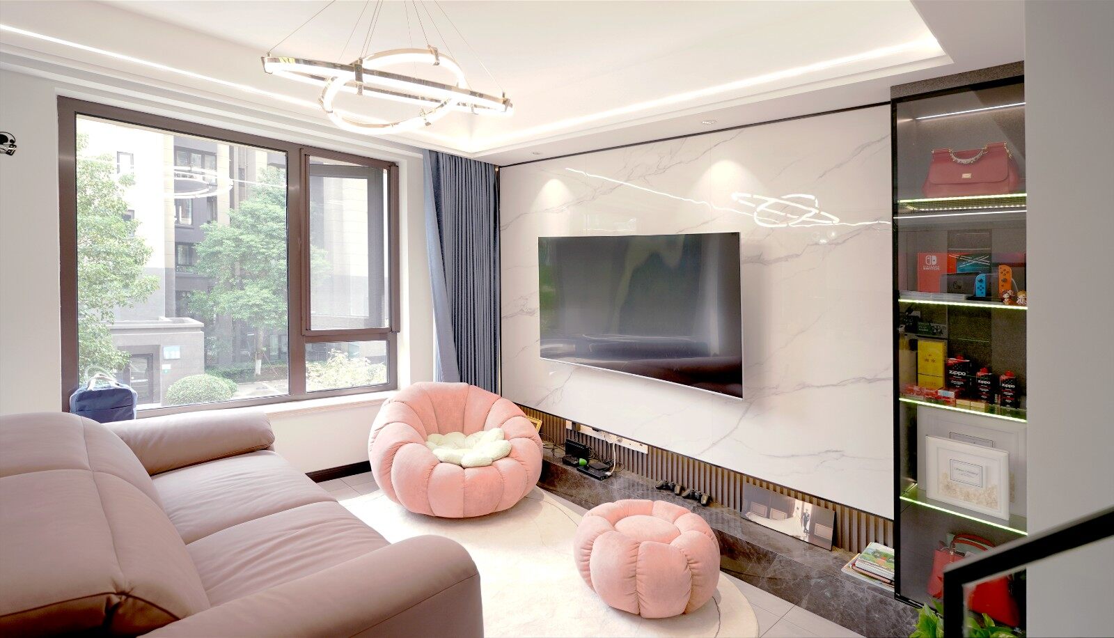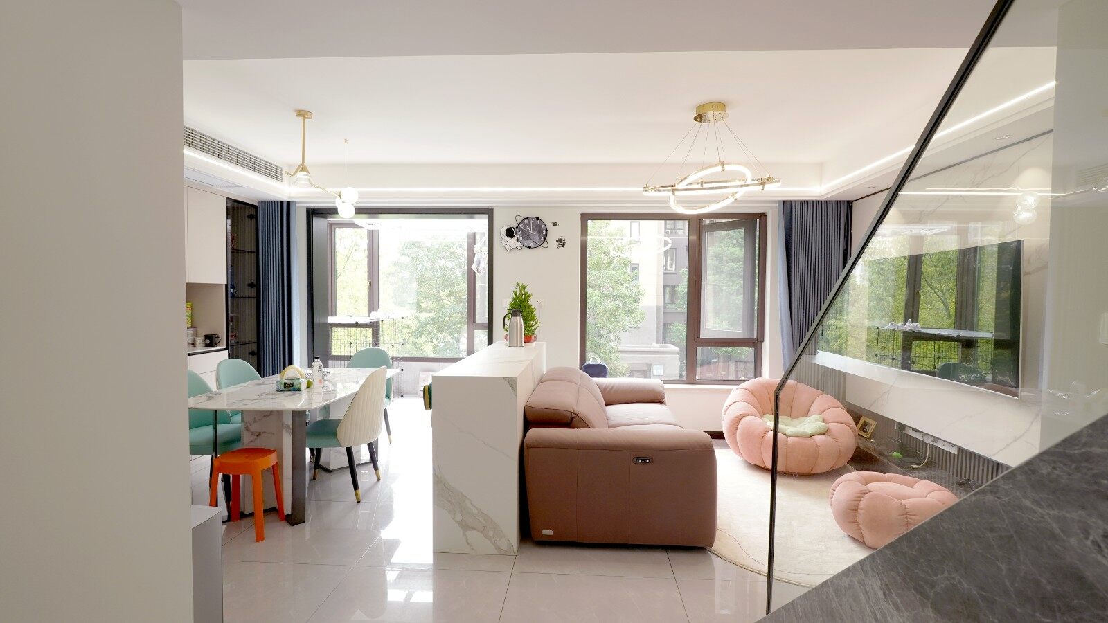 本案为老房翻新项目,位于嘉定的104平复式住宅,常年五口人居住,夫妻俩的父母及女儿三代同堂,夫妻年龄30岁左右,小孩4周岁,所以在前期沟通设计思路的时候需要多一些小孩和老人注意的地方,之前的空间结构没有划分好,明明空间不小却显得非常局促,采光也很昏暗,夫妻俩希望设计师在原有房屋基础上,稍作调整后,可以规划出足够强大的收纳空间,提升整体空间感。