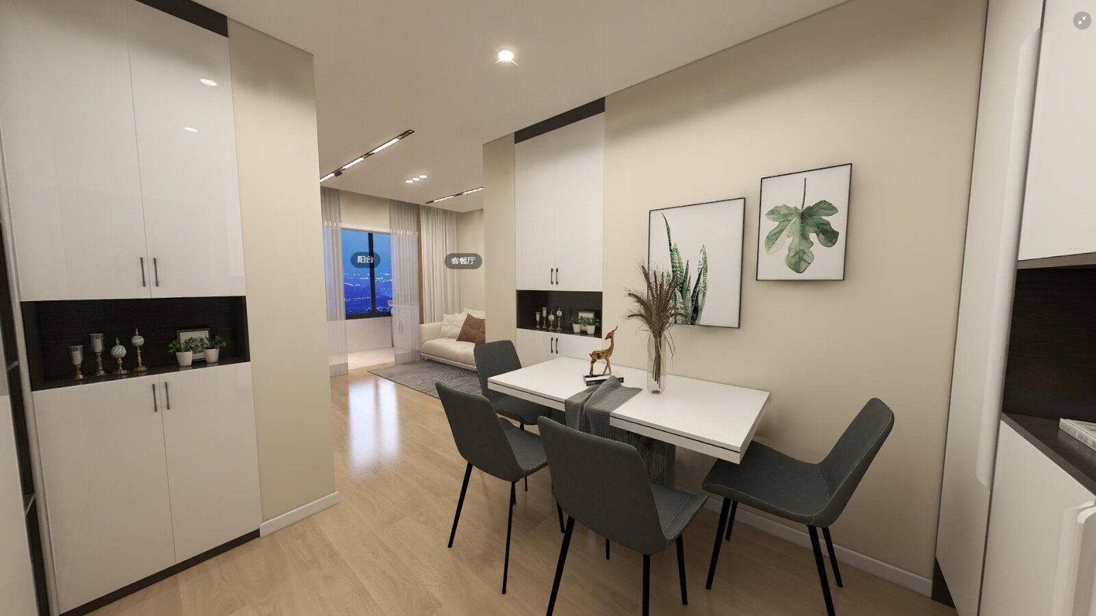 入户处设置玄关柜,方便置物和穿放鞋。厨房过道让出来一部分给到餐厅,延伸了餐厅的空间,提高用餐舒适度。