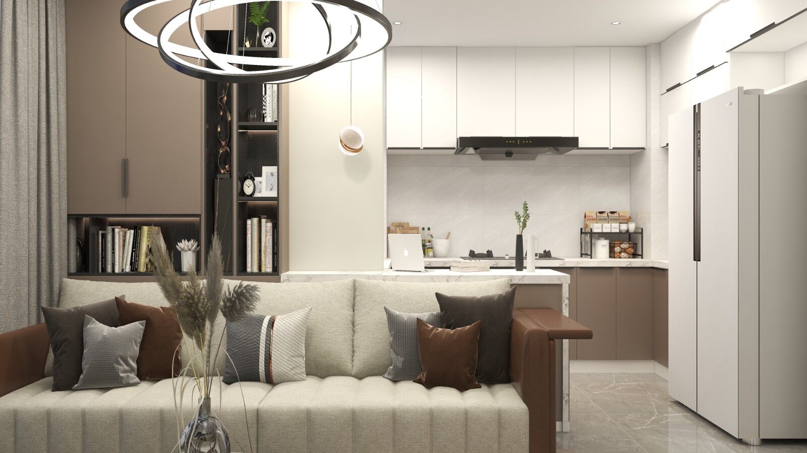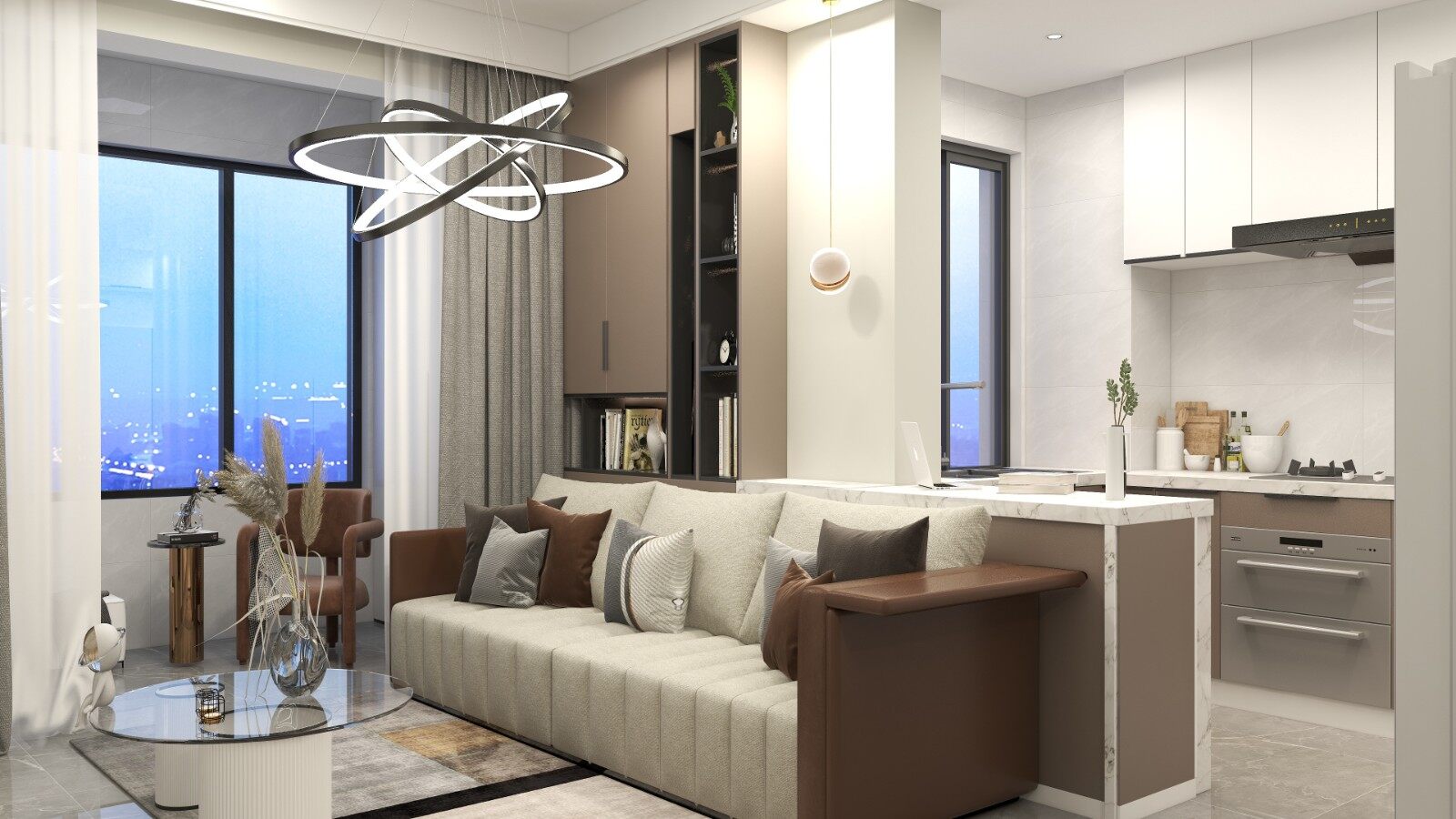 厨房相邻厨房做半开放式设计,拓宽空间面积。设计师使用沙发与吧台划分成两个功能区域,隔而不断也不影响光线穿透,空间视觉统一感更强。
