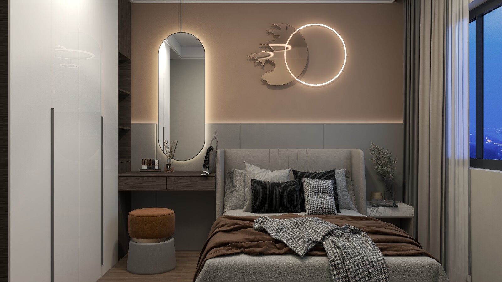 主卧延续现代轻奢的风格,灰色调床铺与背景视觉和谐一致,运用直线与弧线灯光调节情调,增加休息空间温馨柔和的内涵。