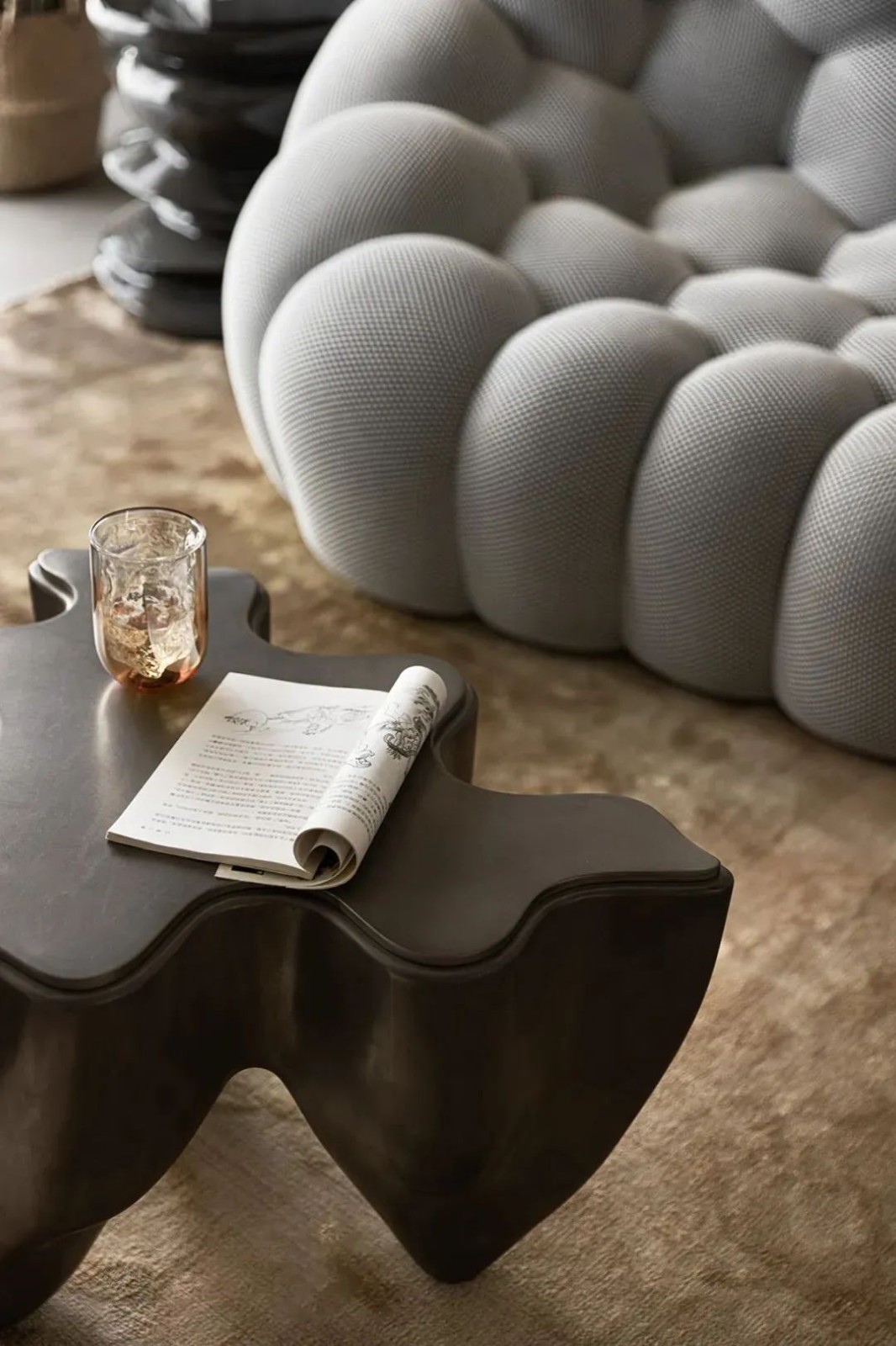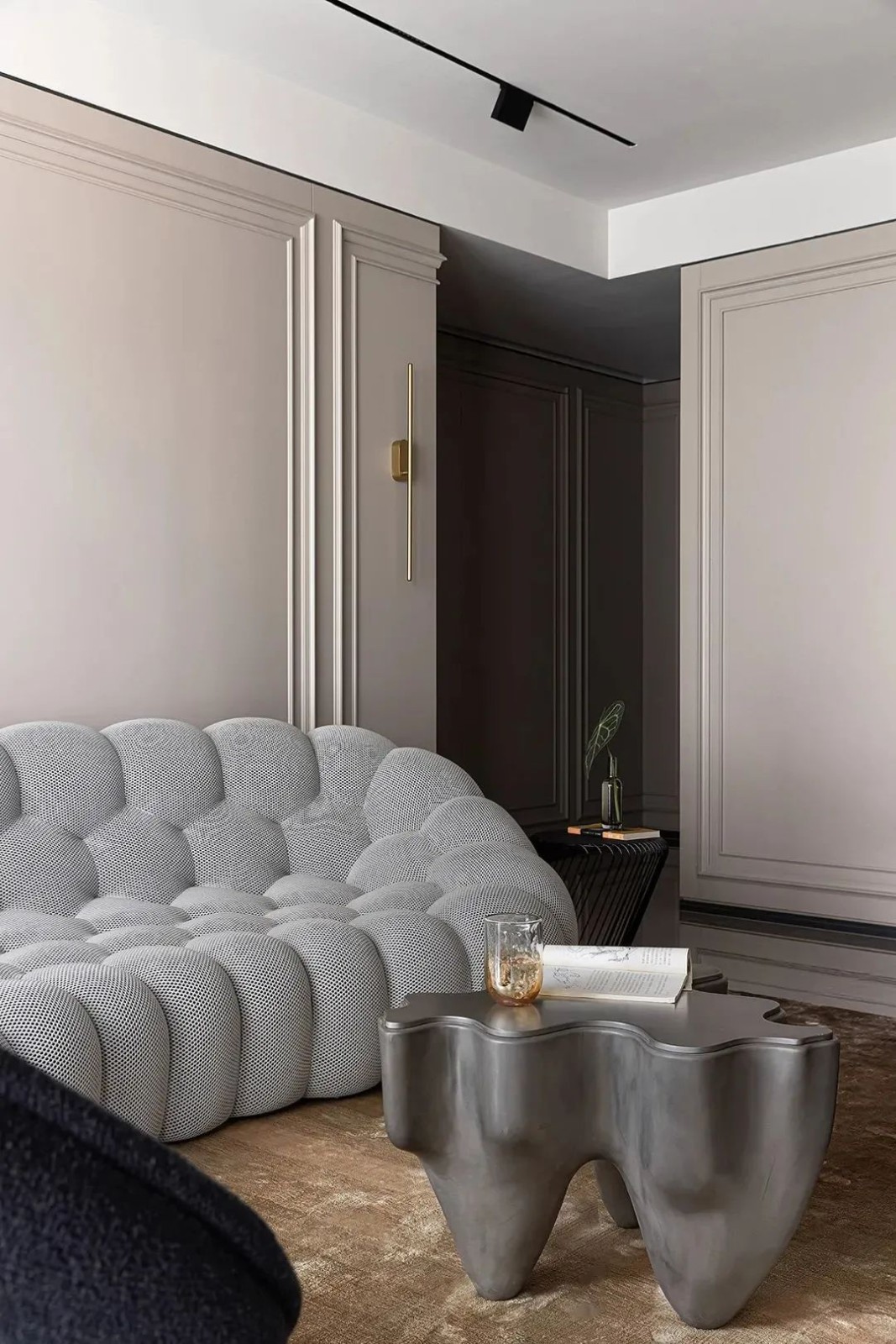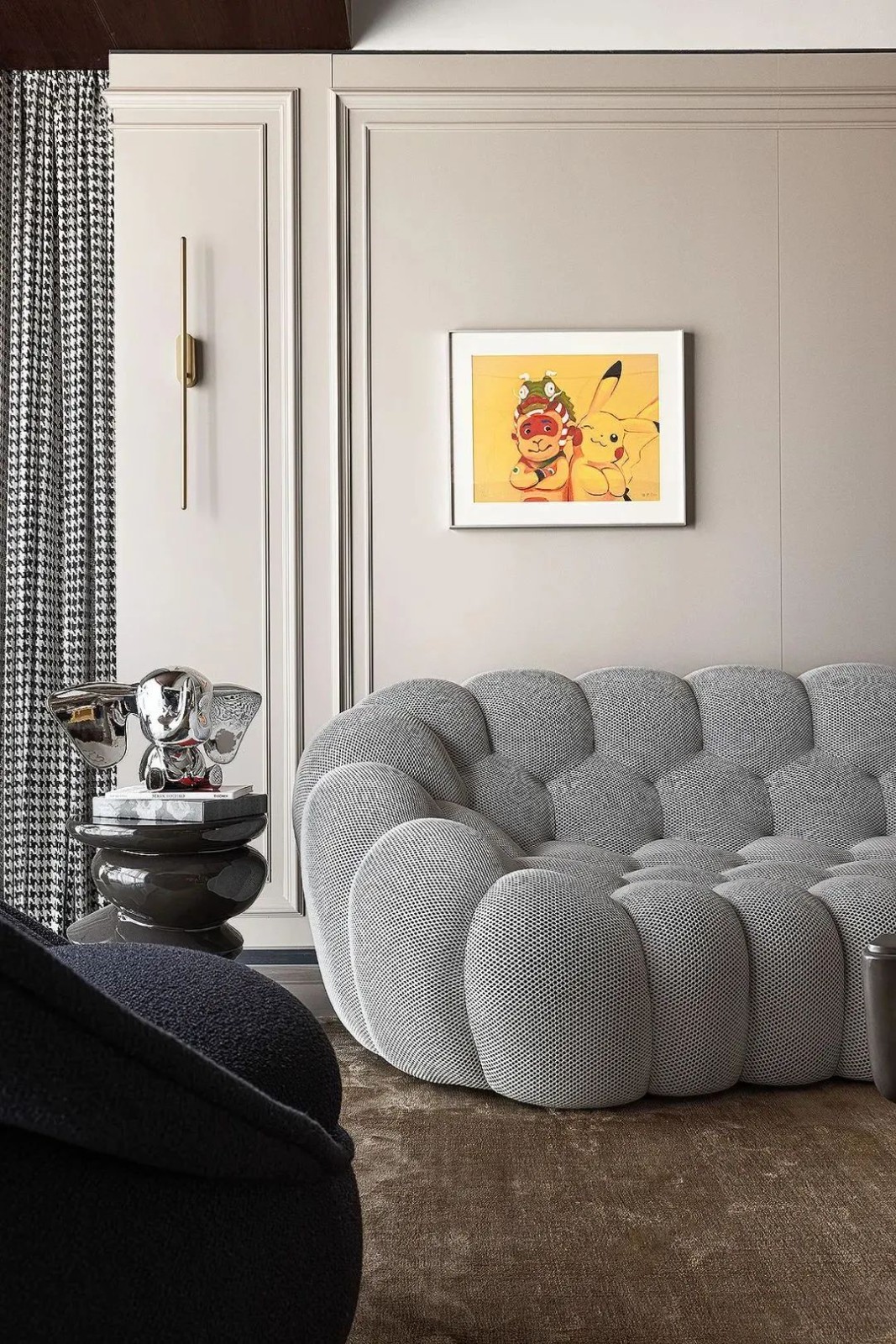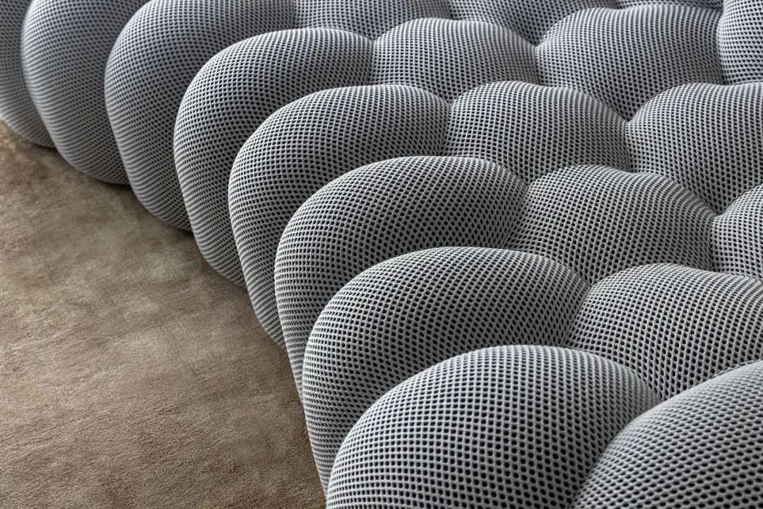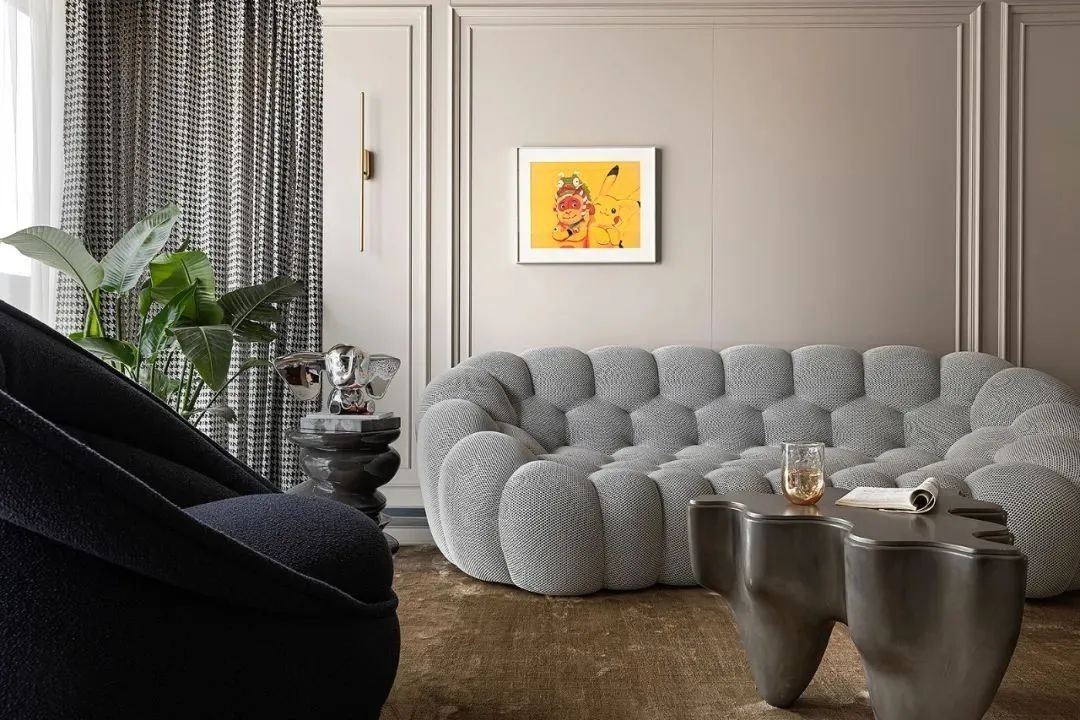 客厅中的Bubble沙发带来自法国品牌,收藏级沙发的色彩与背景墙遥相呼应,精致网纹细节,微微内收的造型设计旨在促进人与人之间的交流。