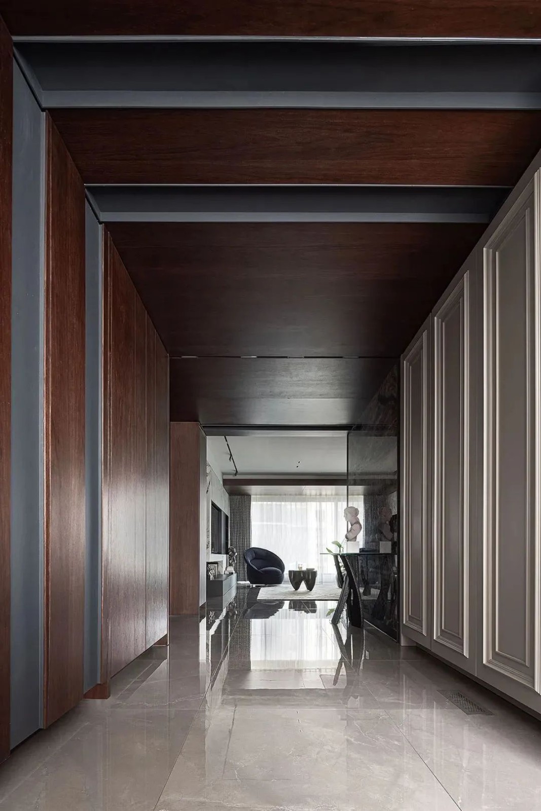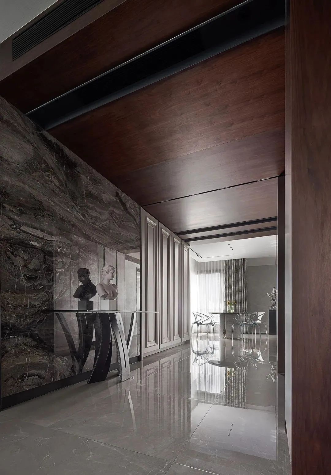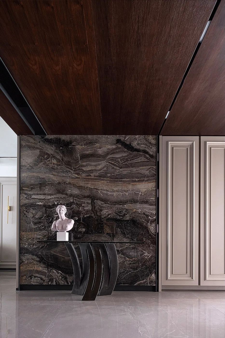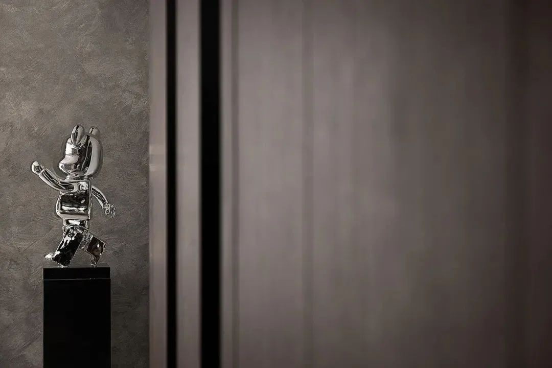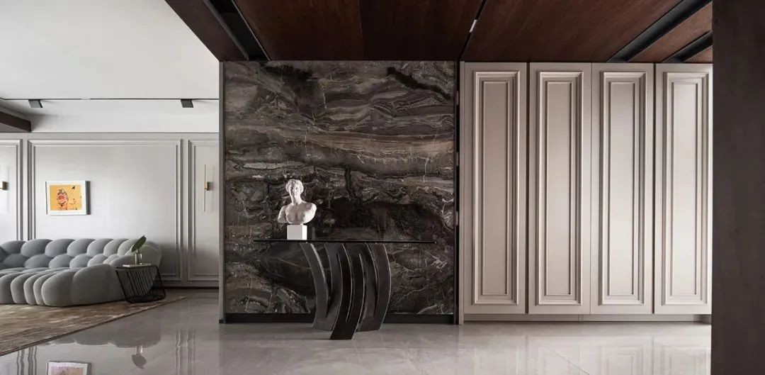 相比用餐区的明亮,家的走廊区域色调变得沉稳起来,设计师有意减少了装饰,让这部分空间更加的纯粹。而不同的材质搭配,丰富空间肌理,尽头的半身雕塑吸引着人们的目光。