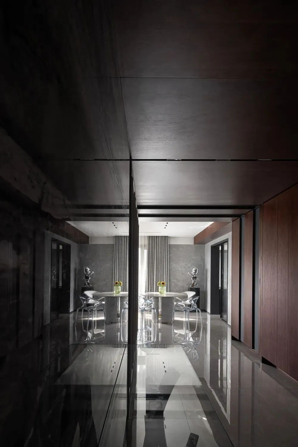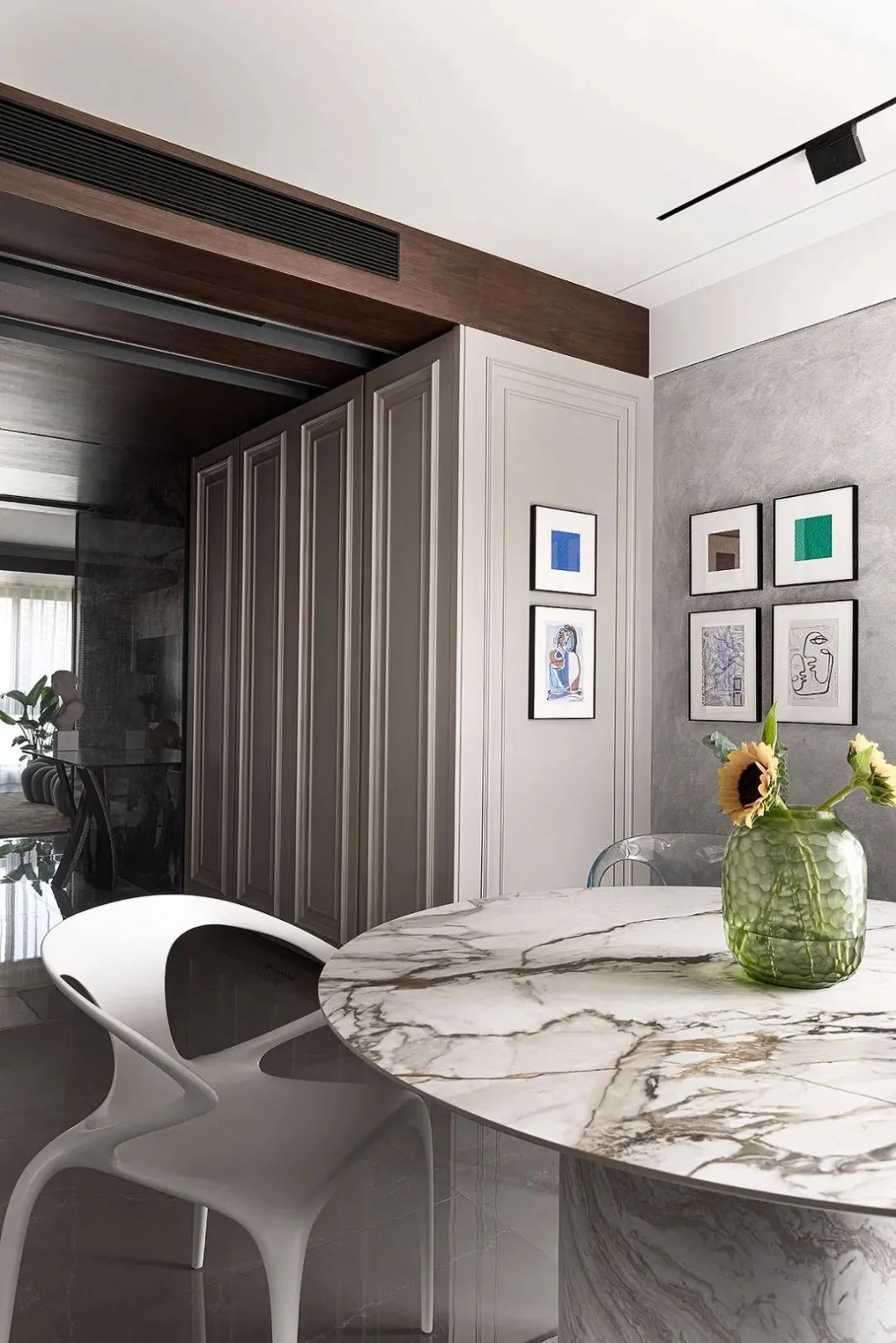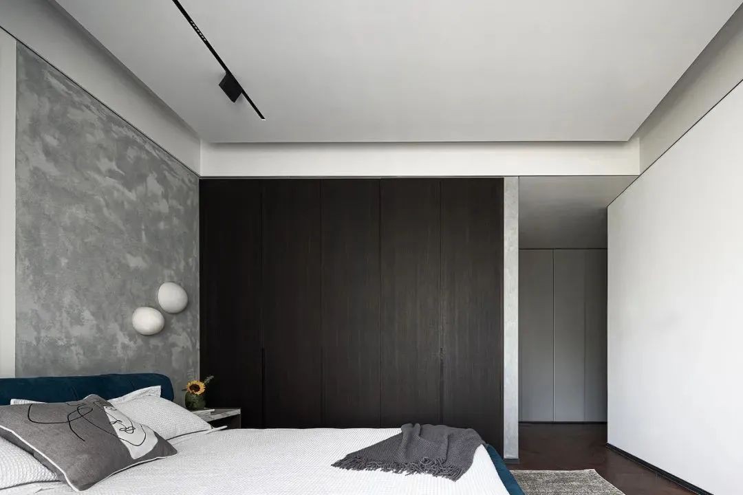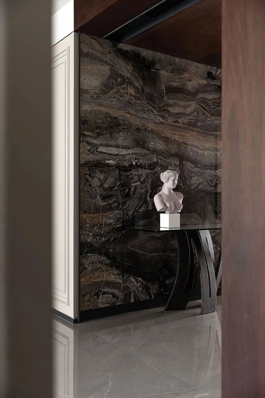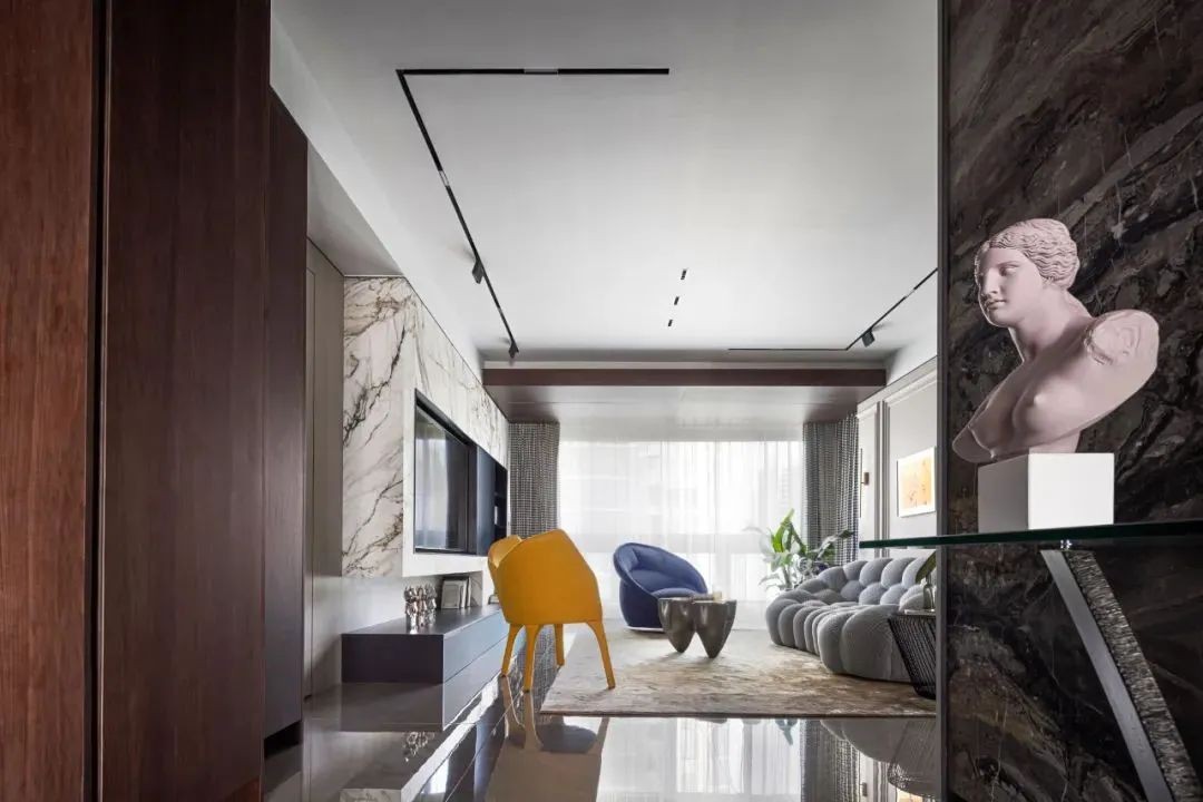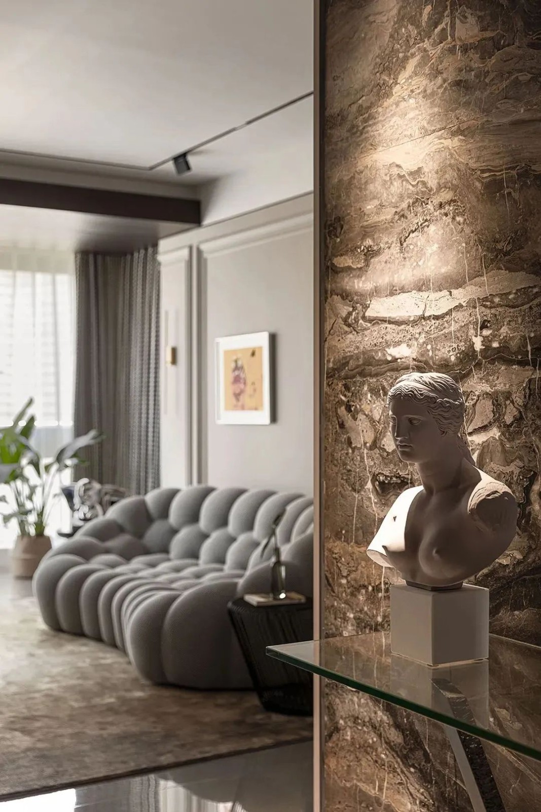 相比用餐区的明亮,家的走廊区域色调变得沉稳起来,设计师有意减少了装饰,让这部分空间更加的纯粹。而不同的材质搭配,丰富空间肌理,尽头的半身雕塑吸引着人们的目光。