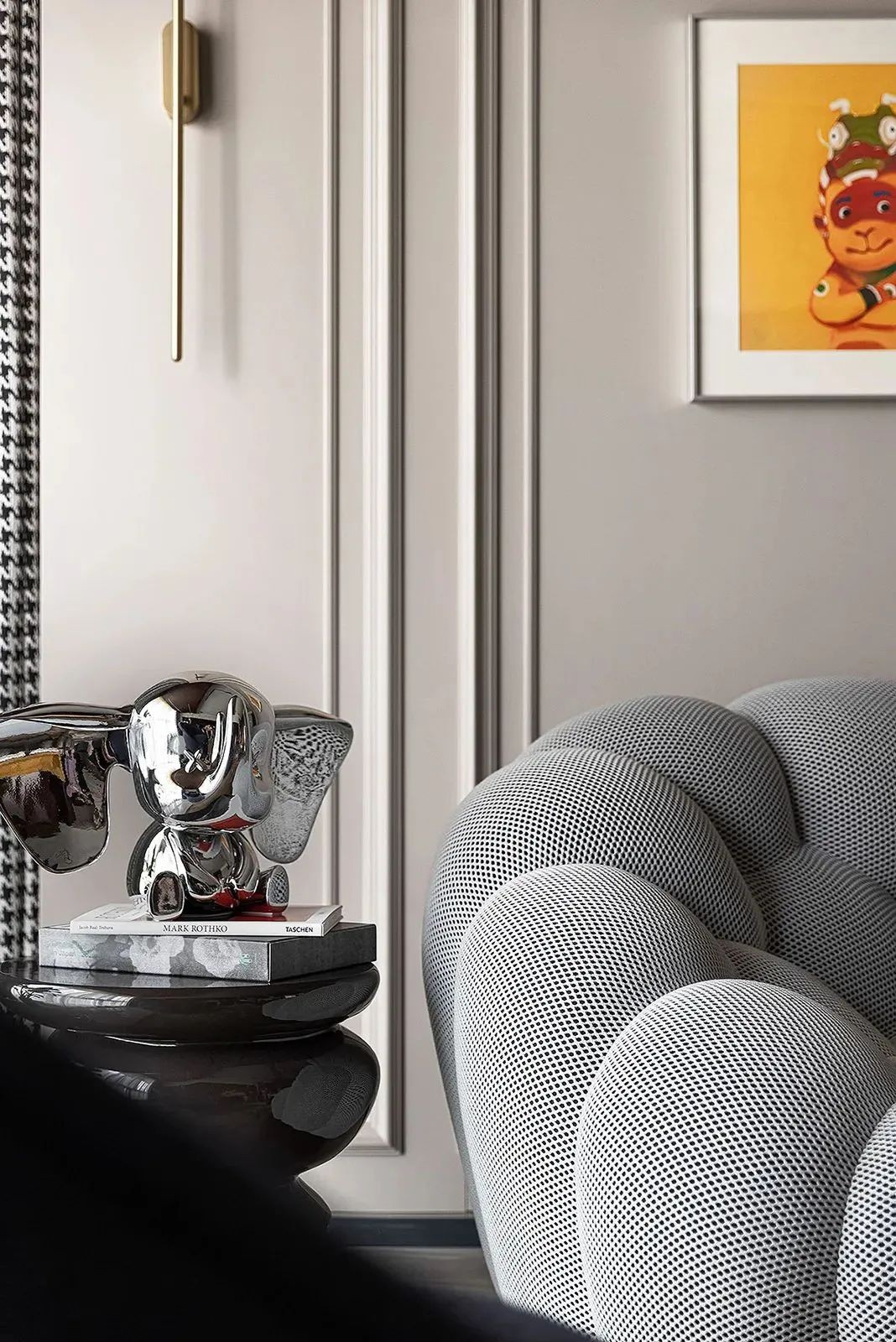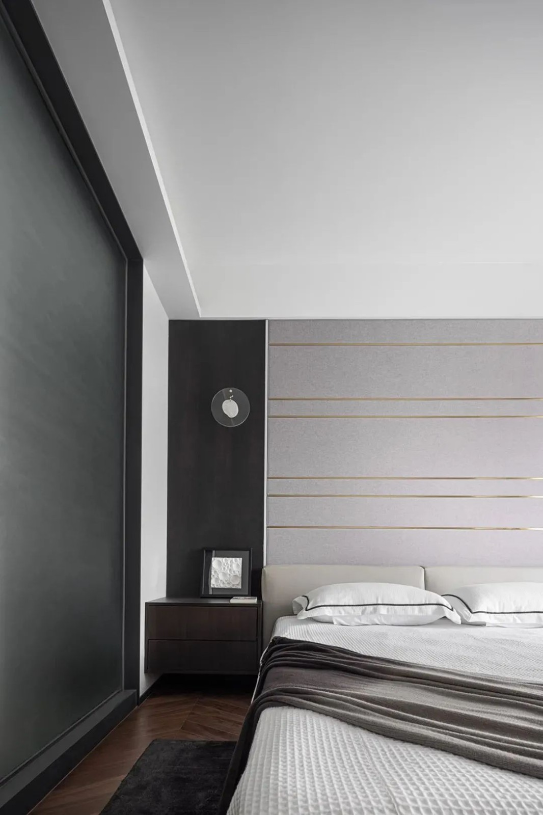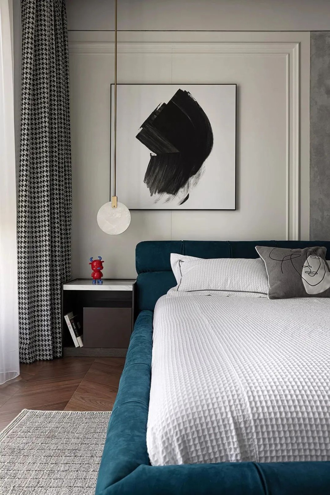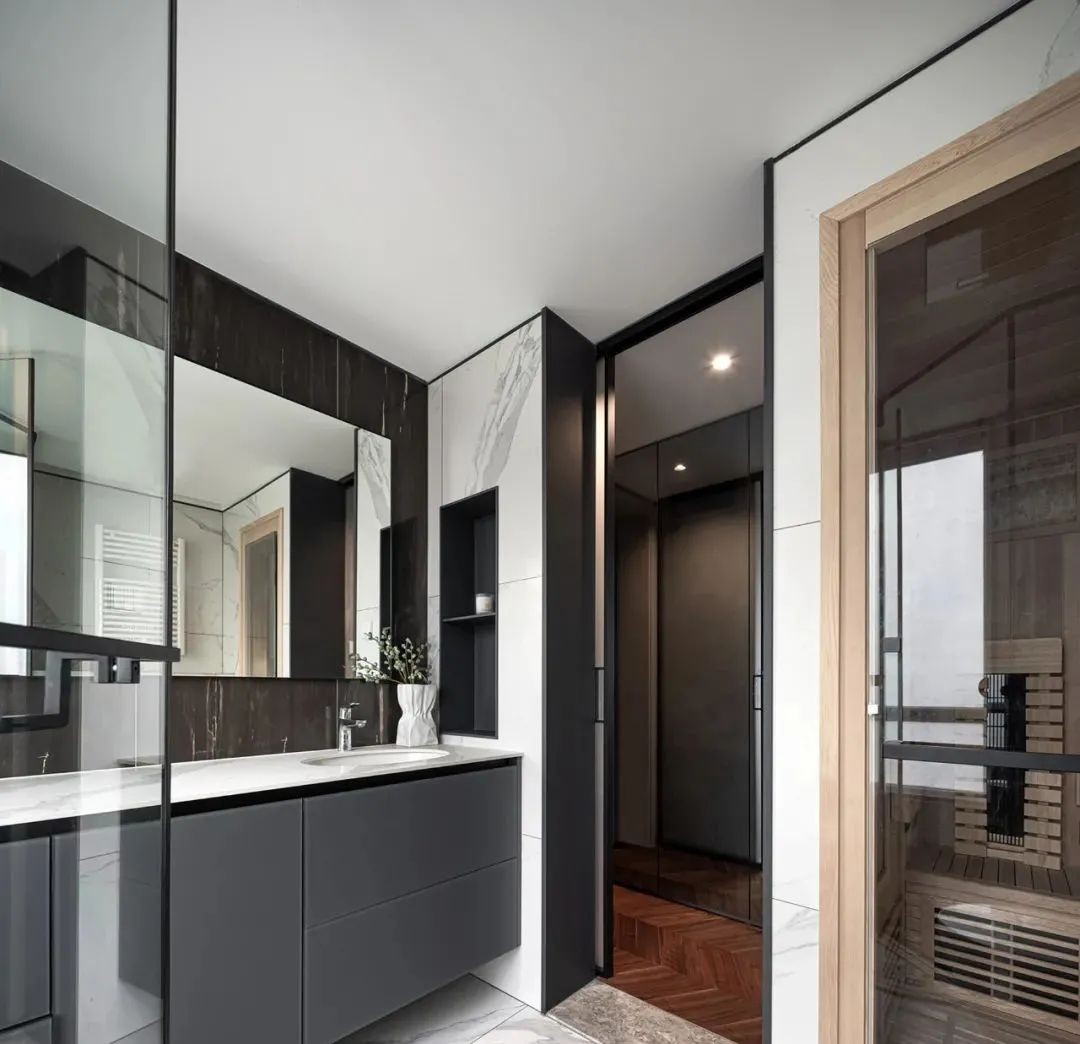 相比用餐区的明亮,家的走廊区域色调变得沉稳起来,设计师有意减少了装饰,让这部分空间更加的纯粹。而不同的材质搭配,丰富空间肌理,尽头的半身雕塑吸引着人们的目光。