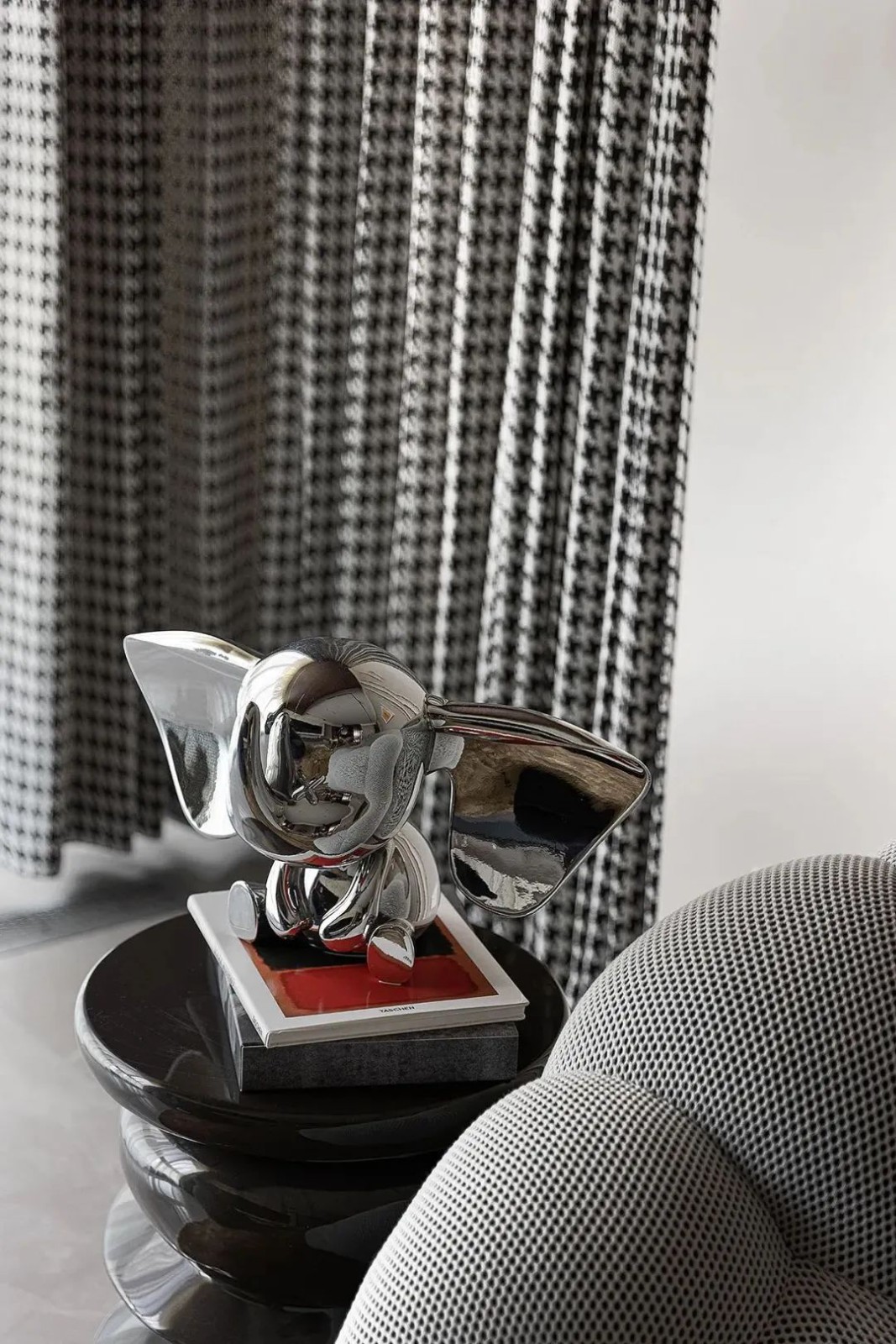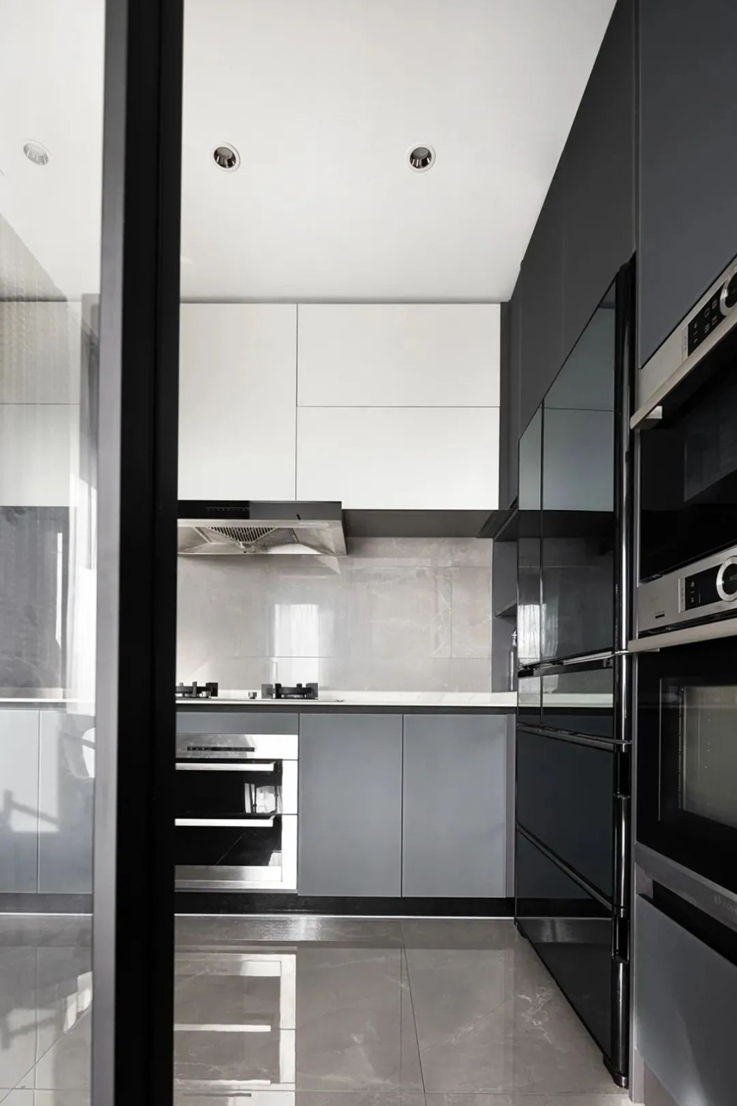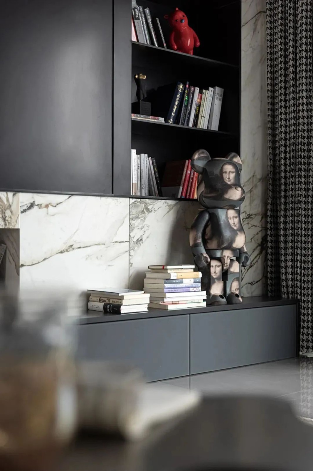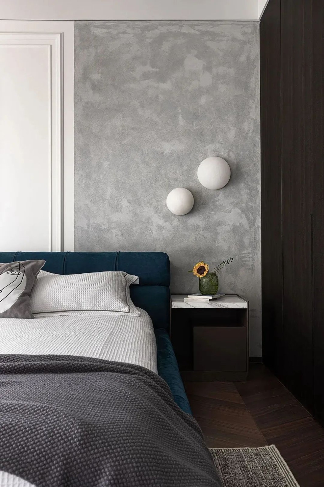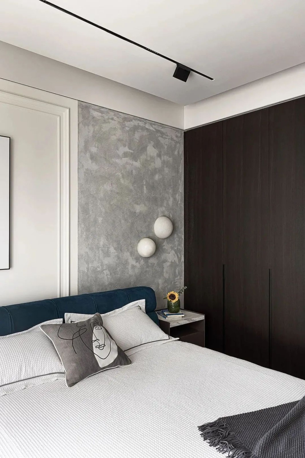 相比用餐区的明亮,家的走廊区域色调变得沉稳起来,设计师有意减少了装饰,让这部分空间更加的纯粹。而不同的材质搭配,丰富空间肌理,尽头的半身雕塑吸引着人们的目光。