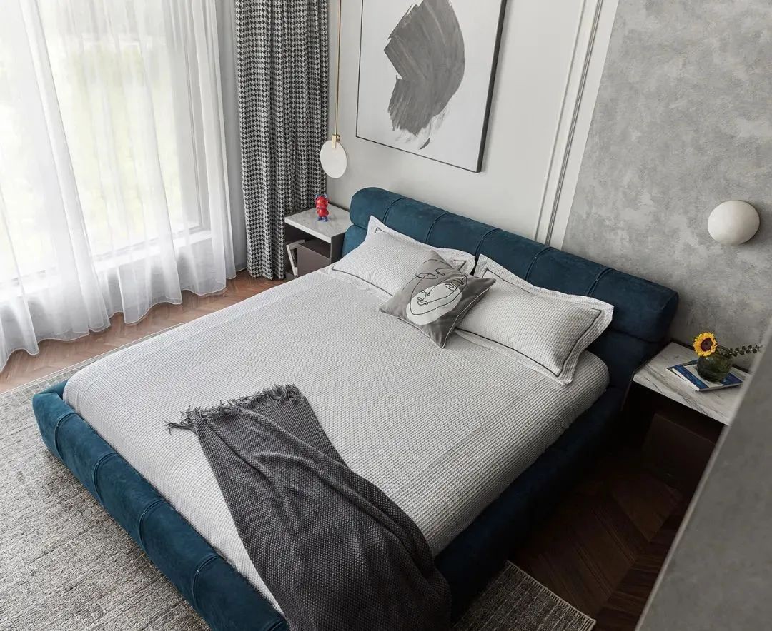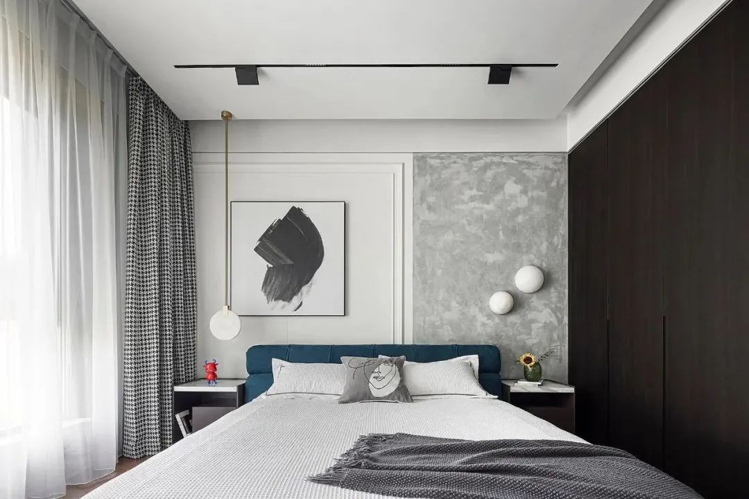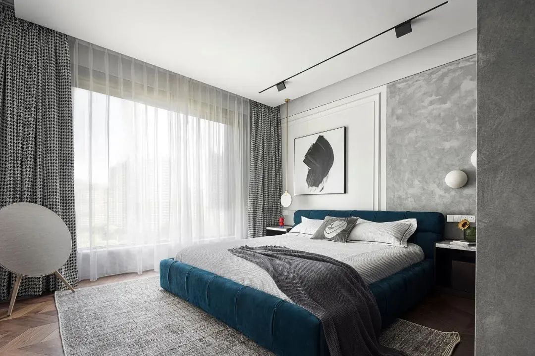卧室的落地窗让空间光线十分充足,墙上挂着一副水墨画在不同的角度上观赏均有不同的视觉效果。