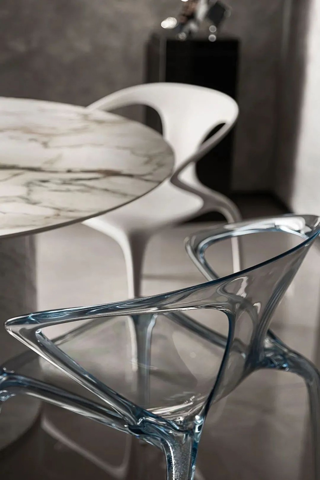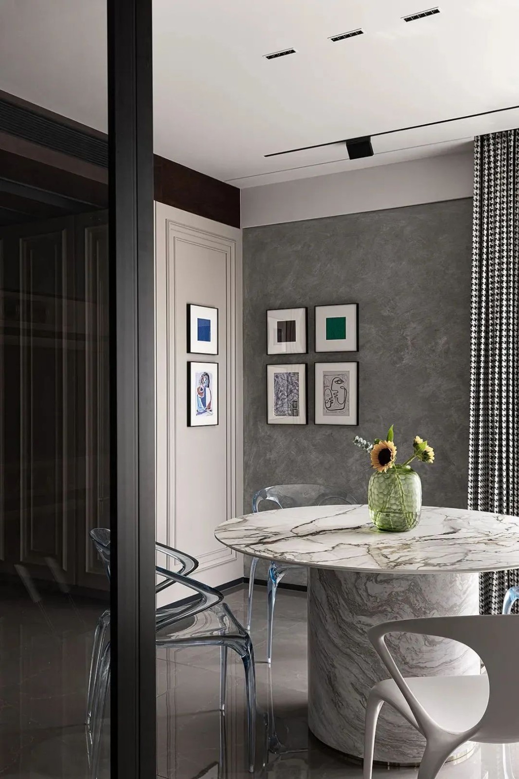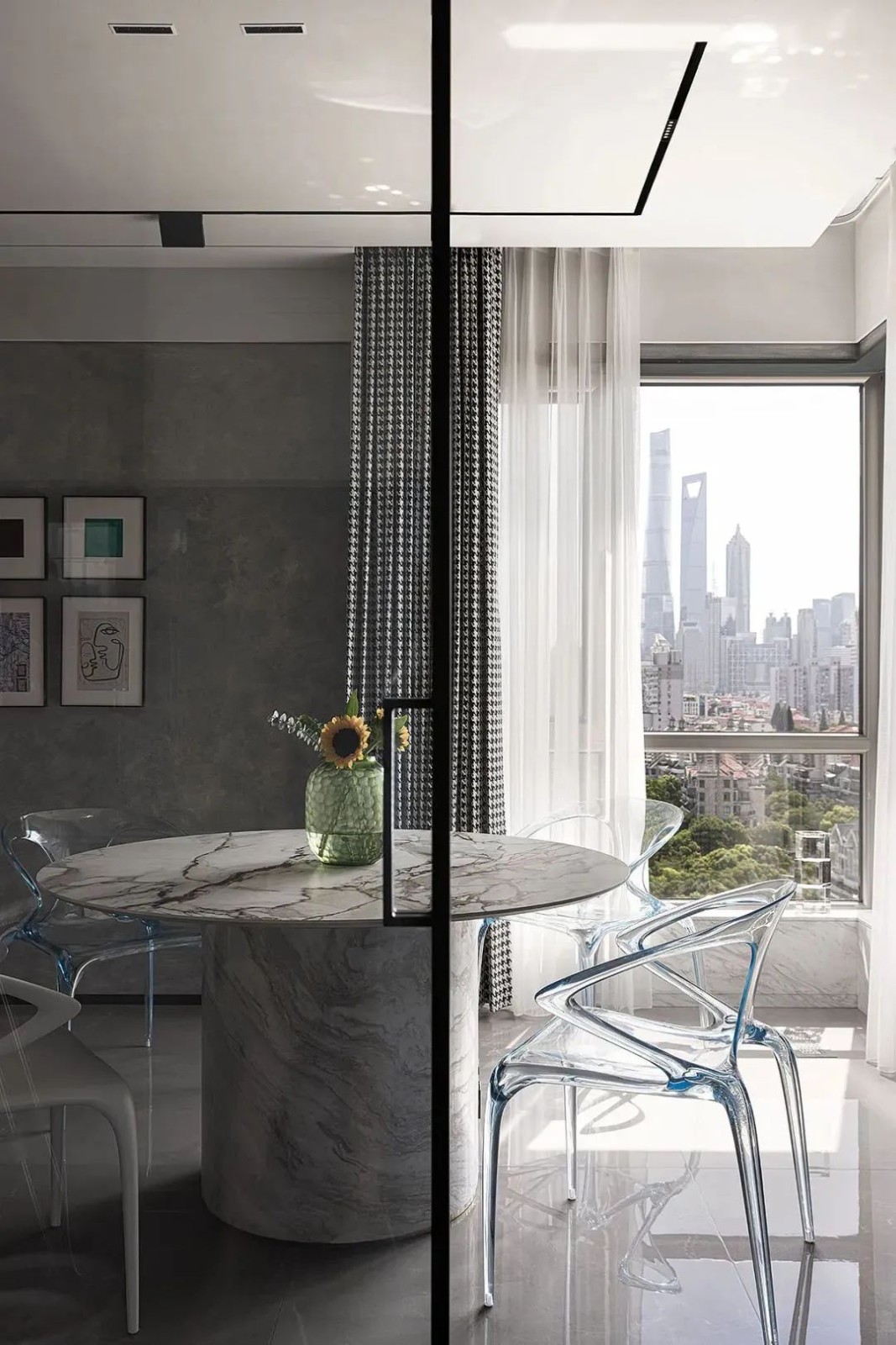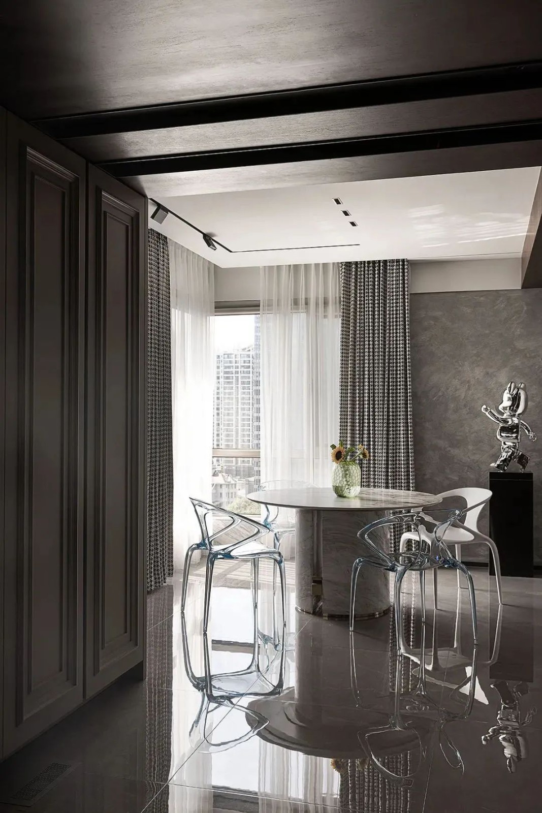 餐桌旁的落地窗起到借景作用,让用餐时间也变得愉快,轻松俯瞰CBD美景,餐桌旁搭配AVA餐椅,晶莹剔透中带来些许轻盈感,空间的高级感迎面而来。