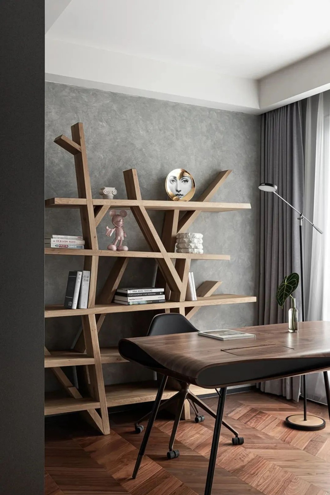 书房拥有更多木的温润特质,设计师常恩根据不同的使用需求选用了不同质感的木材,细节带来自然的放松与舒适。这样安静的环境,可以让居者拥有更加高质量的阅读体验。