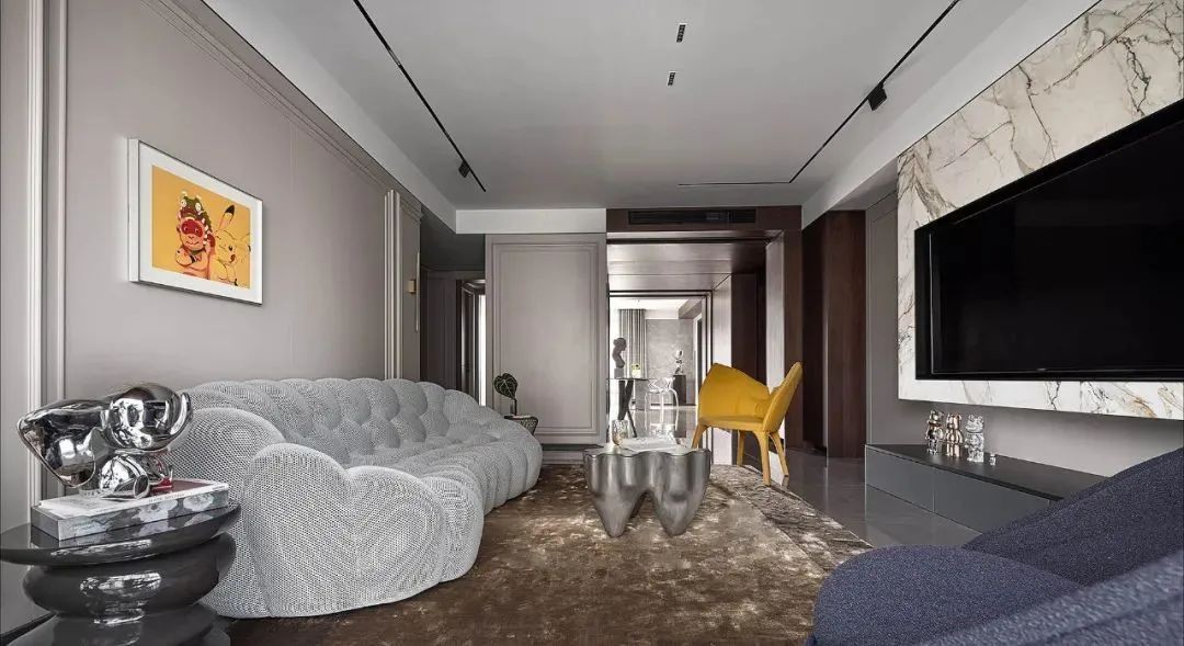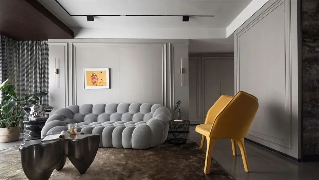 上海商住公寓,一个现代且具有艺术气息的家,灰色白色的空间画布上,点缀明黄色、银色等色彩,曲线直线的纵横交错,描绘出都市现代个性化人居空间。