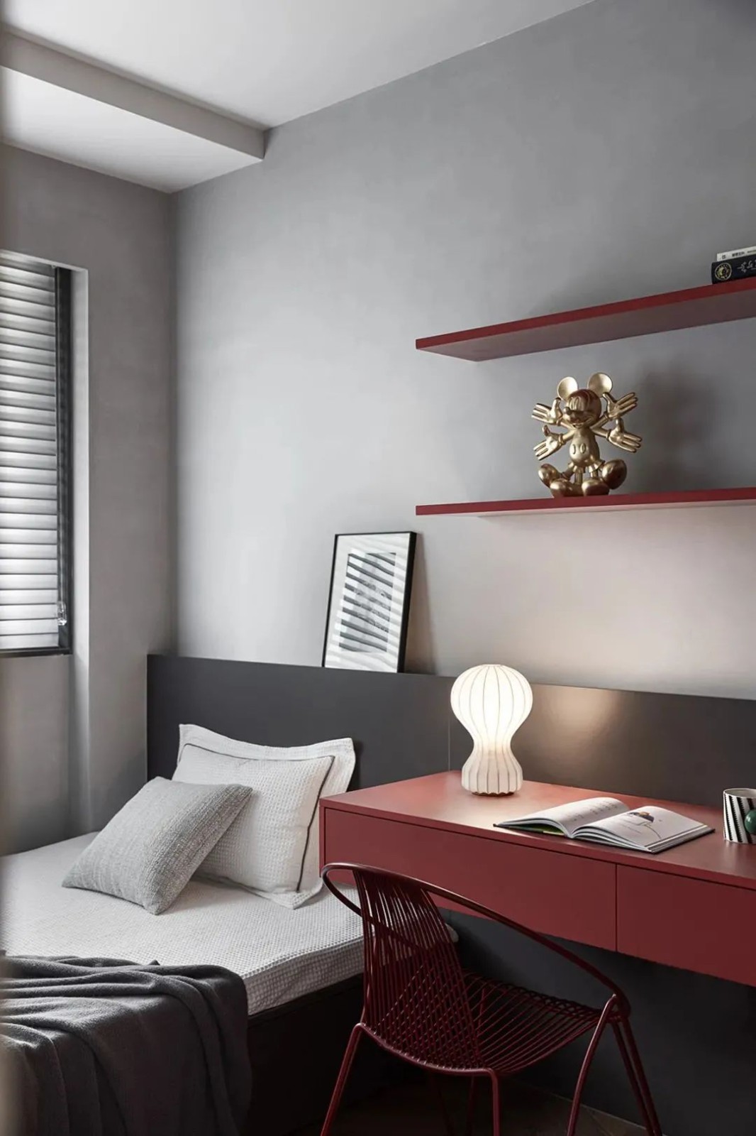 另一间卧室黑白色的背景之下是鲜红色的置物架和学习桌椅,这样的色彩搭配更好的完成了功能分区。
