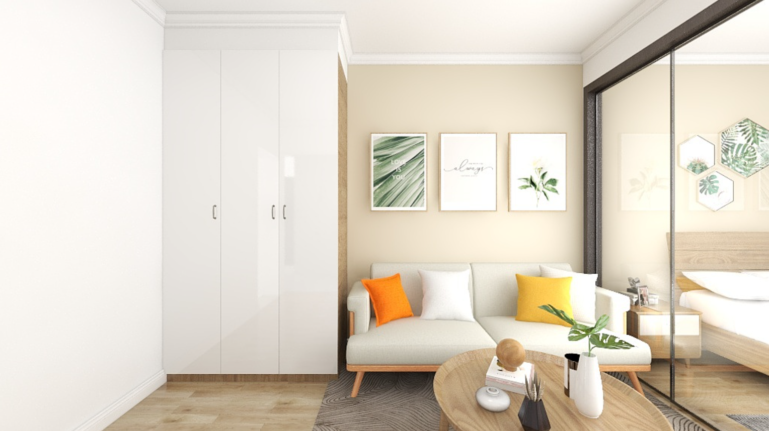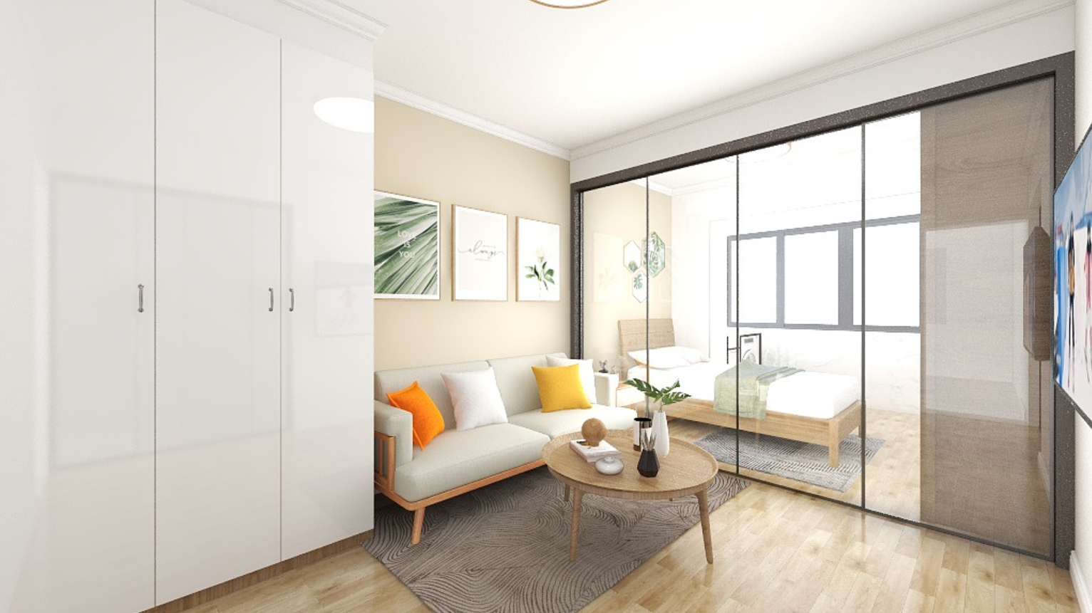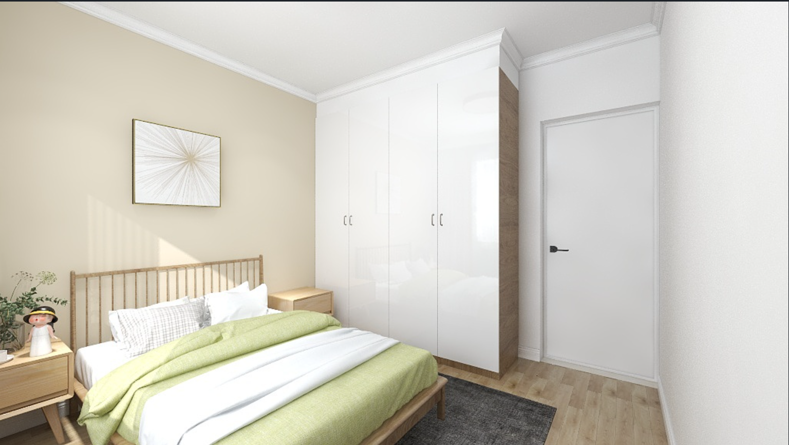 低饱和度的背景更显柔和氛围,并且设置大容量衣柜,足以放置一年四季的衣物,木质地板铺上地毯,更显温馨。
