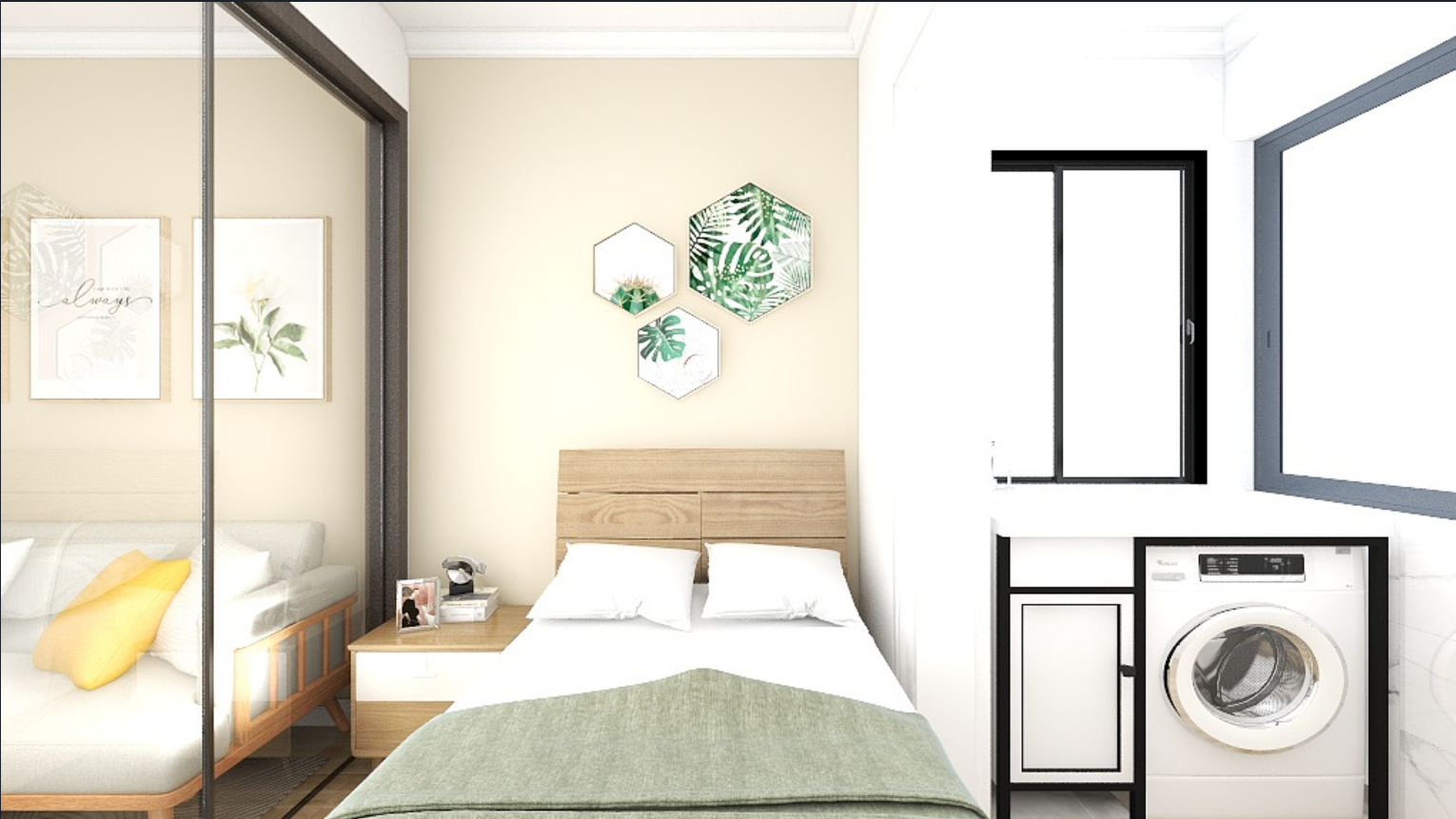 主卧主要是老人住,要求储物多一些,看起来空间大,做了一排柜子跟阳台融为一个空间。
