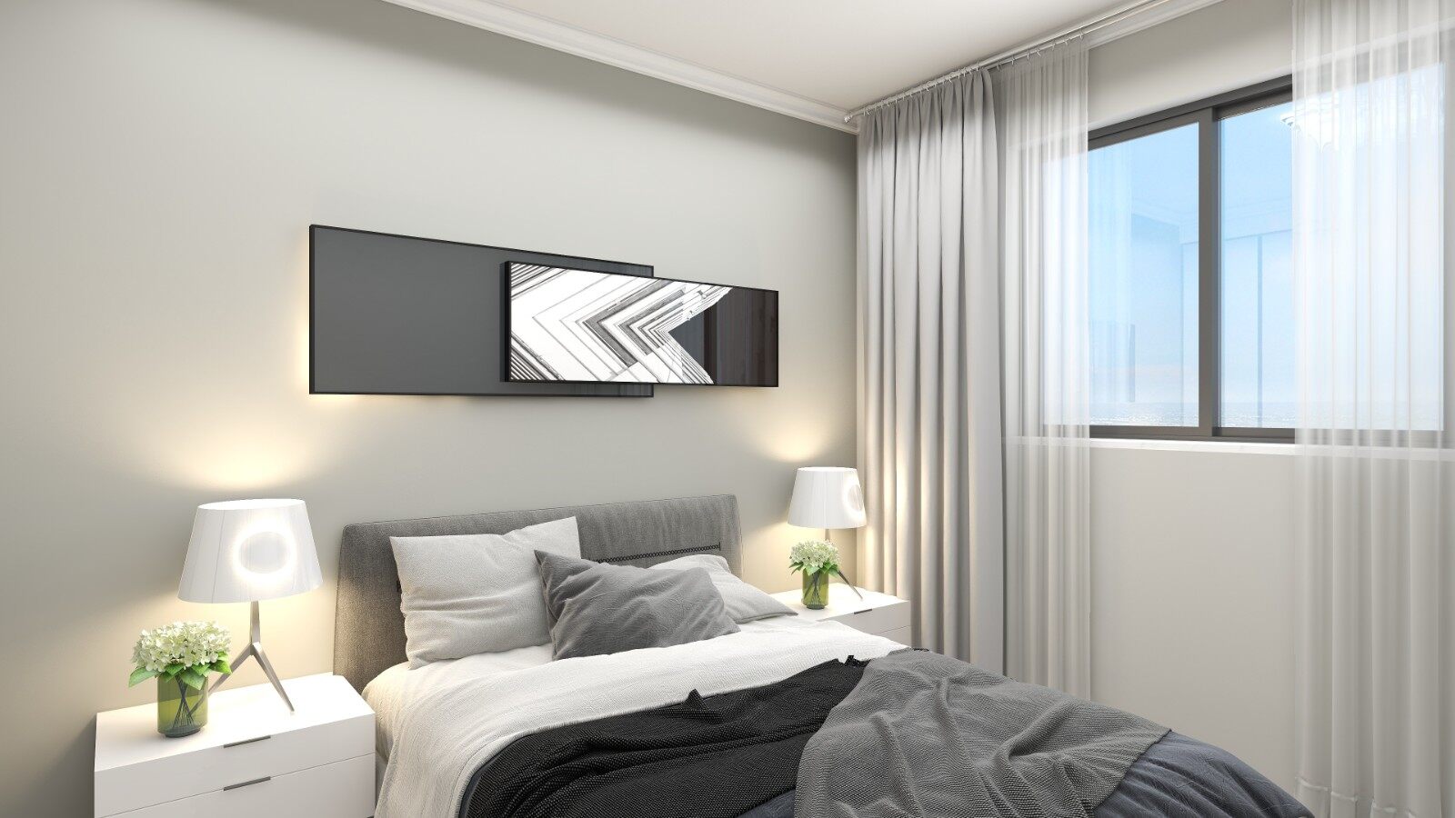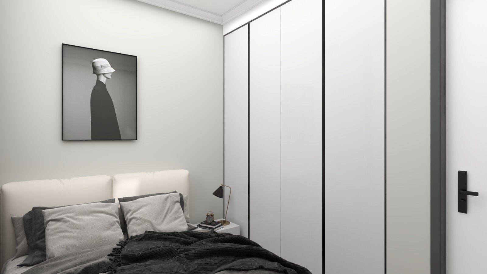 次卧设置正面衣柜,整体灰色调将空间其他颜色和元素都和谐相融,用细腻的设计阐述家的温馨。