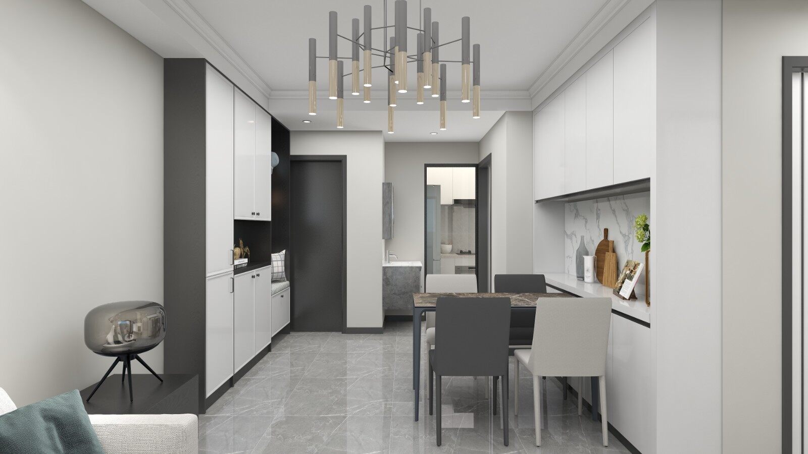 餐厅将餐桌设置在收纳柜旁边,增加储物空间。灰色的储物柜也与空间气质相一致,实用与美观齐头并进!