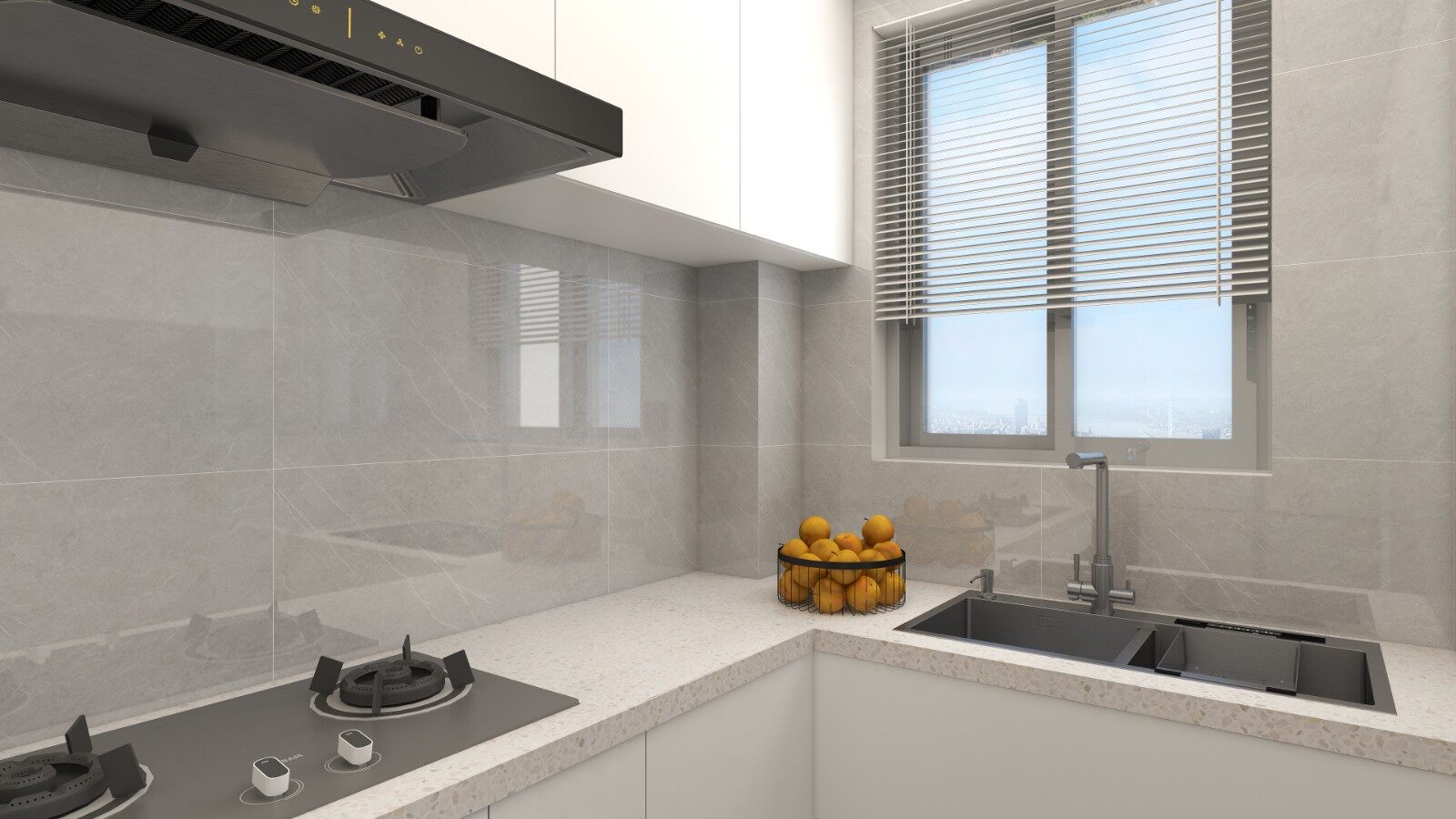 厨房设置为L型操作台,动线科学合理,下厨更省时,提高效率!搭配低饱和度的颜色也能营造出平和的视觉效果。