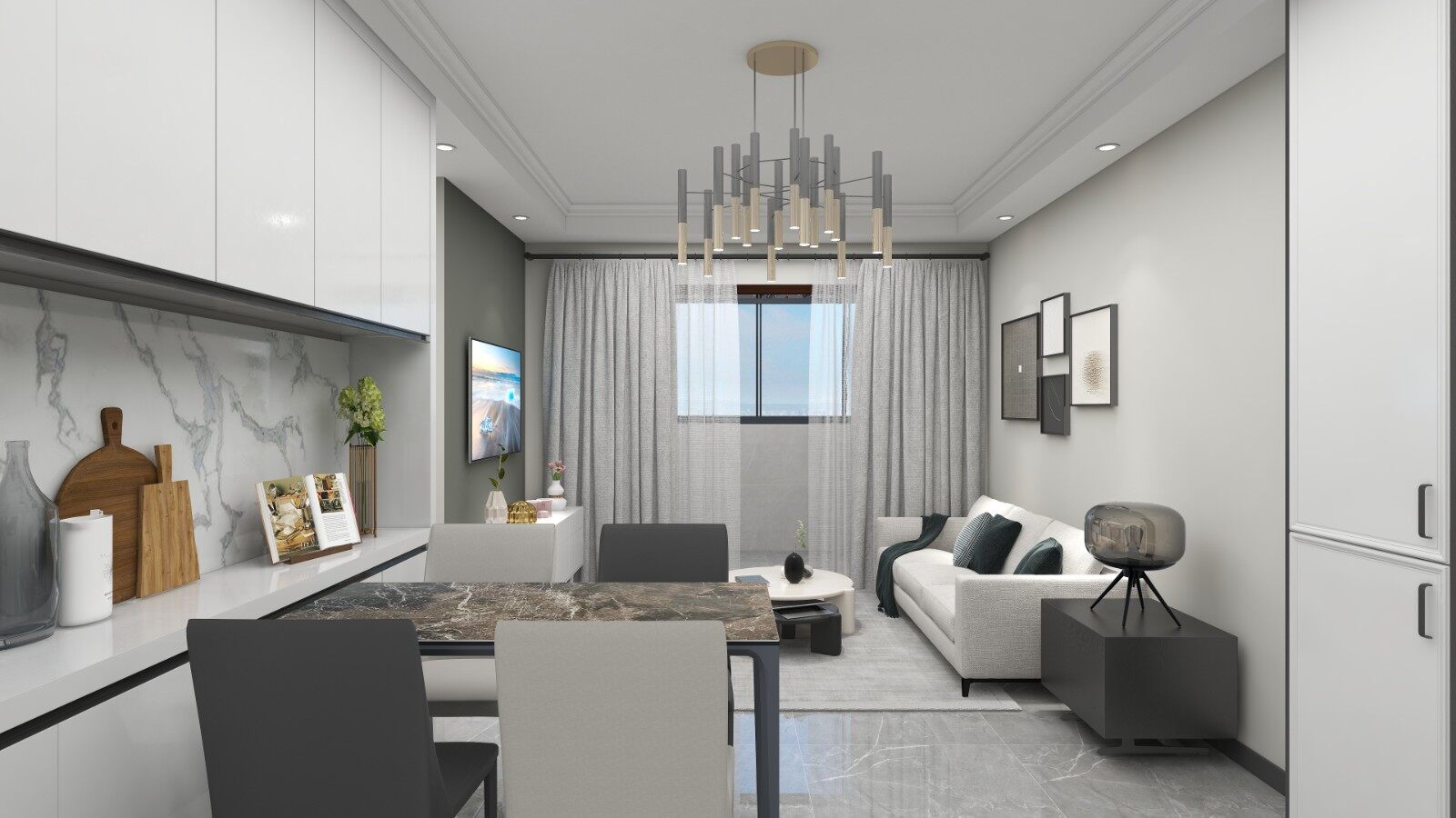 客餐厅一体化设计,有着放大空间的效果!空间在材质选择上以经久耐看的黑白灰为基调,以优雅自然为目标。